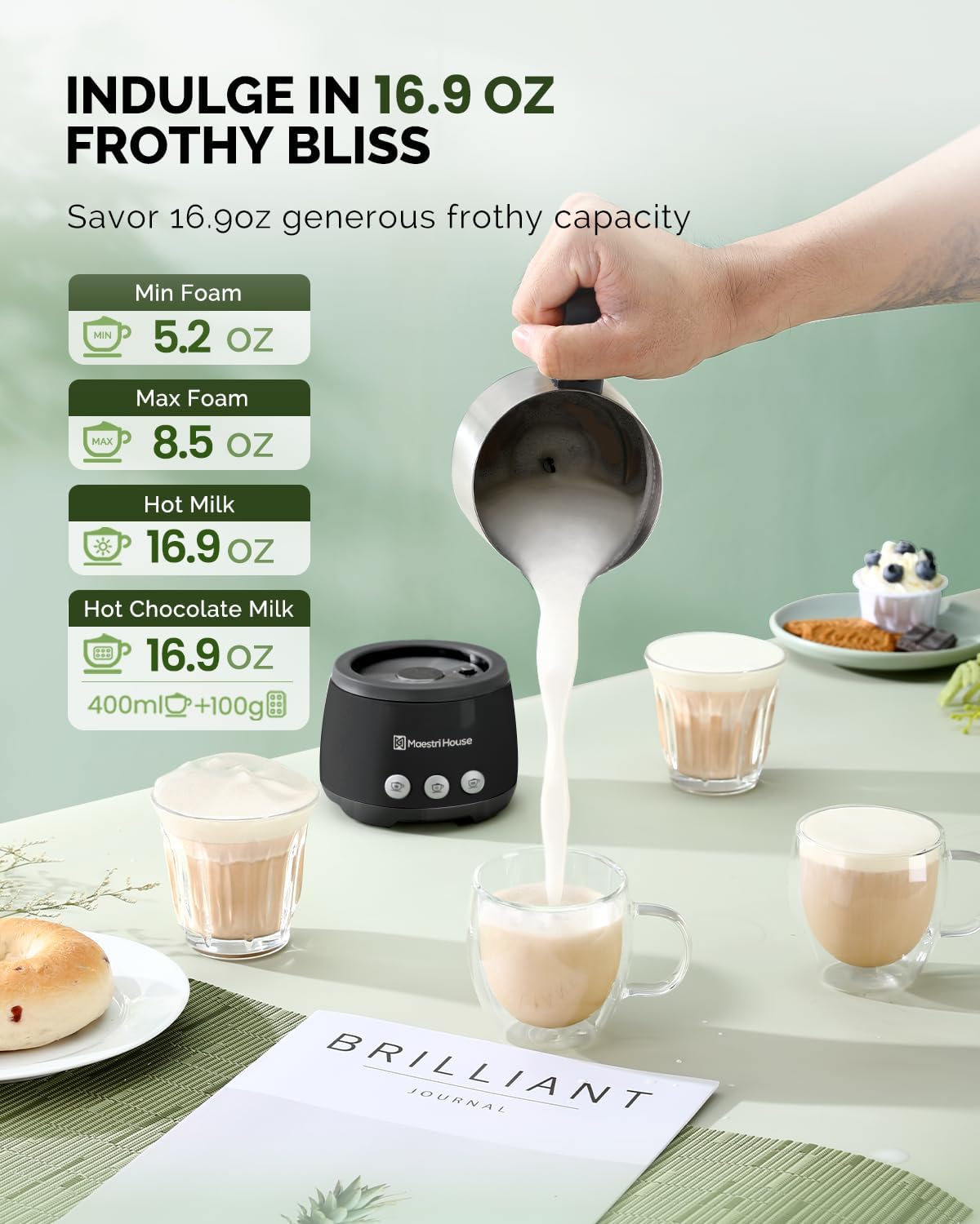 Indulge in 16.9OZ Frothy Bliss: Adjustable capacities from 150ml (5.2oz) to 250ml (8.8oz) for frothy delights, and up to 500ml (16.9oz) for hot milk. Create the perfect hot chocolate blend with a precise scale of 400ml (13.5oz) milk to 100g (3.52oz) chocolate powder. Enhance your beverage-making experience with customizable capacities to satisfy all your cravings, ensuring a delightful treat every time!