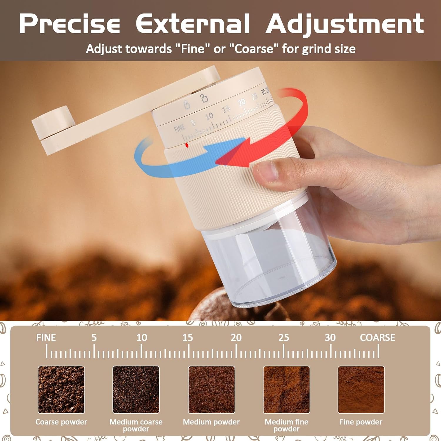 1. 35+ Grind Settings & Instant Adjustability NANSPATH Manual Coffee Grinder: Top-mounted external knob offers 35+ precise grind levels (French Press to Espresso) with no disassembly. Achieve café-quality consistency in seconds – ideal for portable coffee grinder enthusiasts seeking versatility without complexity.