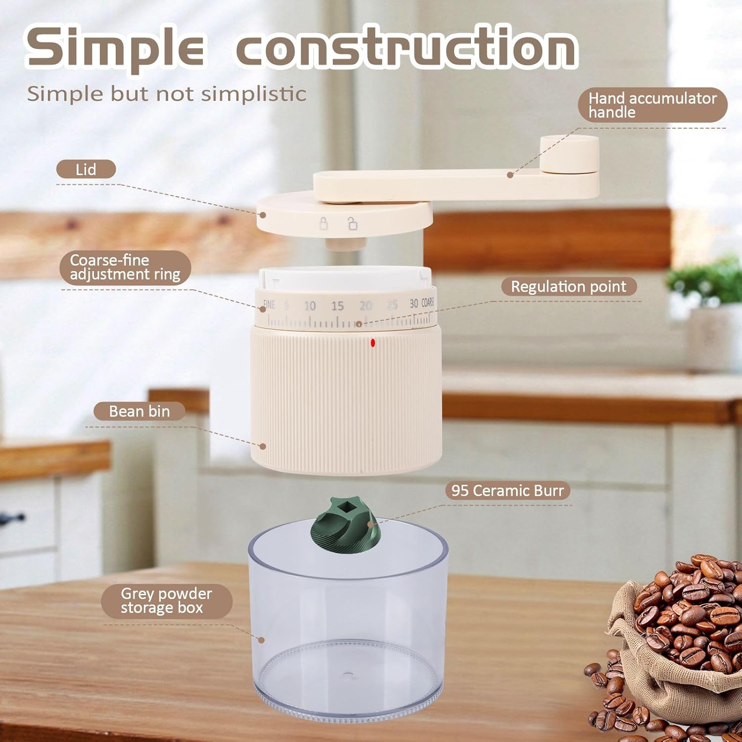 2. Compact & Portable Small Coffee Grinder Weighing 8.29 oz (235g) and measuring 6.3×2.75 inches, this handheld coffee grinder slips into travel mugs, backpack pockets, or laptop cases. Detachable handle design ensures effortless portability for camping, office brewing, or hiking – the ultimate small coffee grinder for on-the-go coffee lovers.
