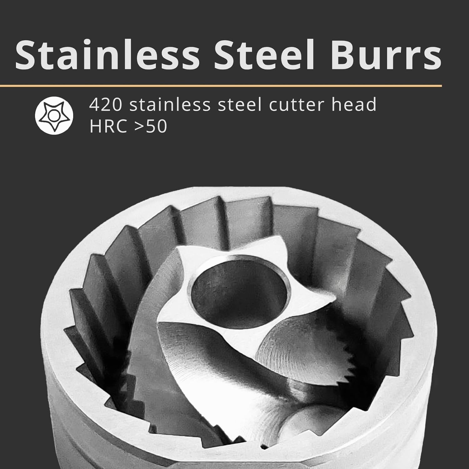 Efficient Grinding Mechanism: Experience smooth and efficient grinding,The burrs are formed by five-axis CNC cutting of high-quality 420 stainless steel. The dual-bearing design ensures stability, while the extended handle makes grinding effortless. The aluminum alloy body with vertical stripes enhances grip, durability, and aesthetic appeal.