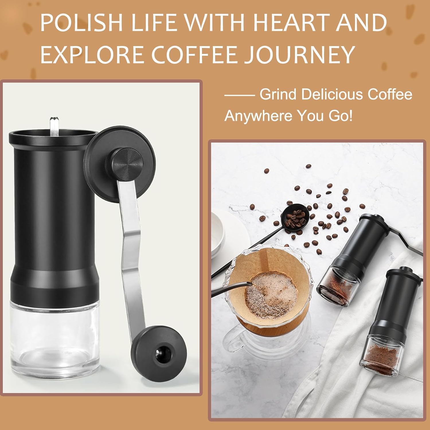 Ceramic grinding core – Stainless steel coffee hand grinder features a spiral grain ceramic grinding core, 5-axis high-precision CNC cutting process so that the abrasive particles are uniform and efficient grinding of coffee beans.