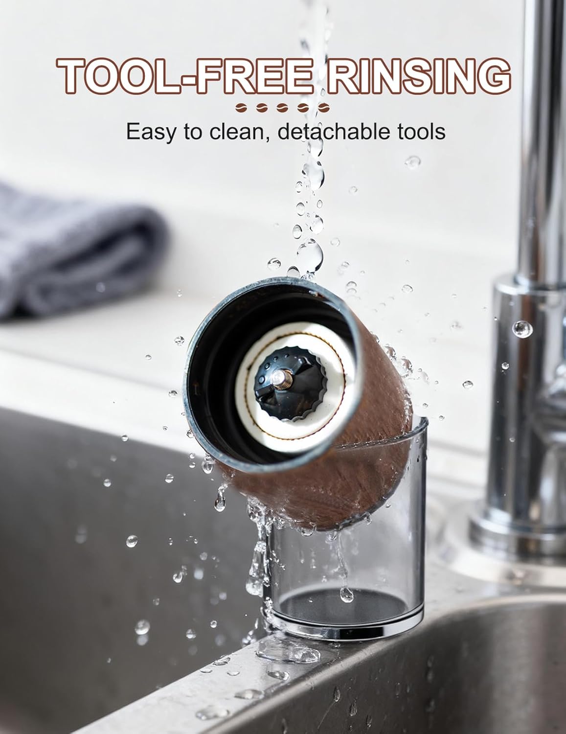 3-Part Quick-Clean System & Elegant Design:Maintenance is simple with the tool-free, 3-part disassembly system. Rinse components under running water for instant cleanup. Finished with a sophisticated wood grain aesthetic, this grinder combines easy maintenance with stylish durability for any setting.