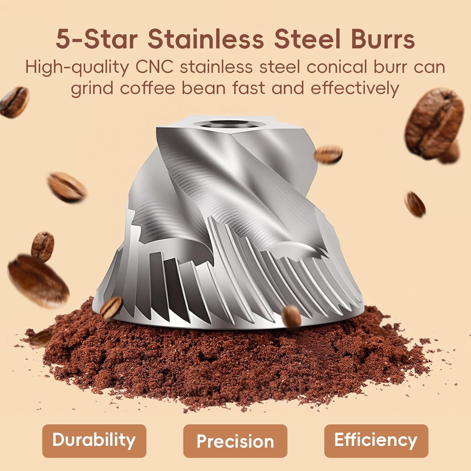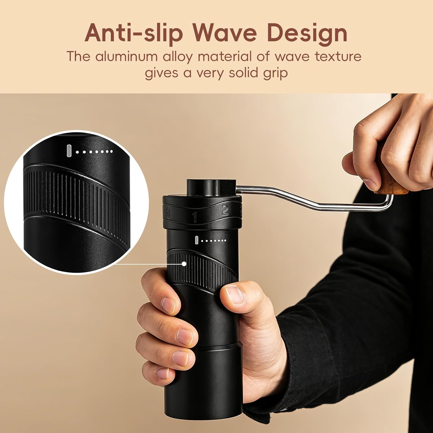 Unique Design: This high-precision burr coffee grinder features a non-slip wave texture for a secure, comfortable grip; its extended handle ensures effortless, smooth grinding with minimal effort