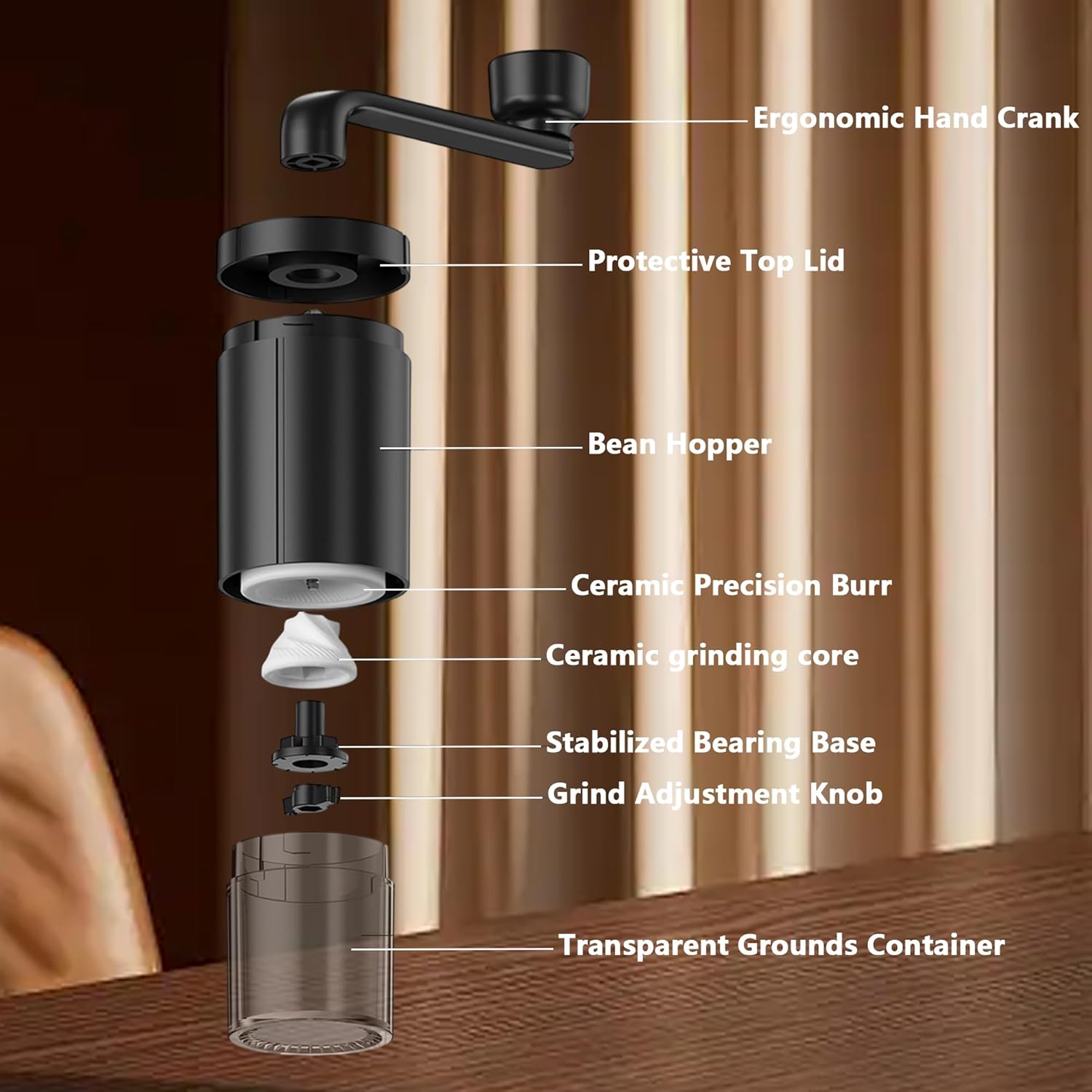 Manual hand crank design reduces noise compared to electric grinders. The stainless steel handle offers smooth rotation and comfortable grip, making grinding easy and enjoyable.