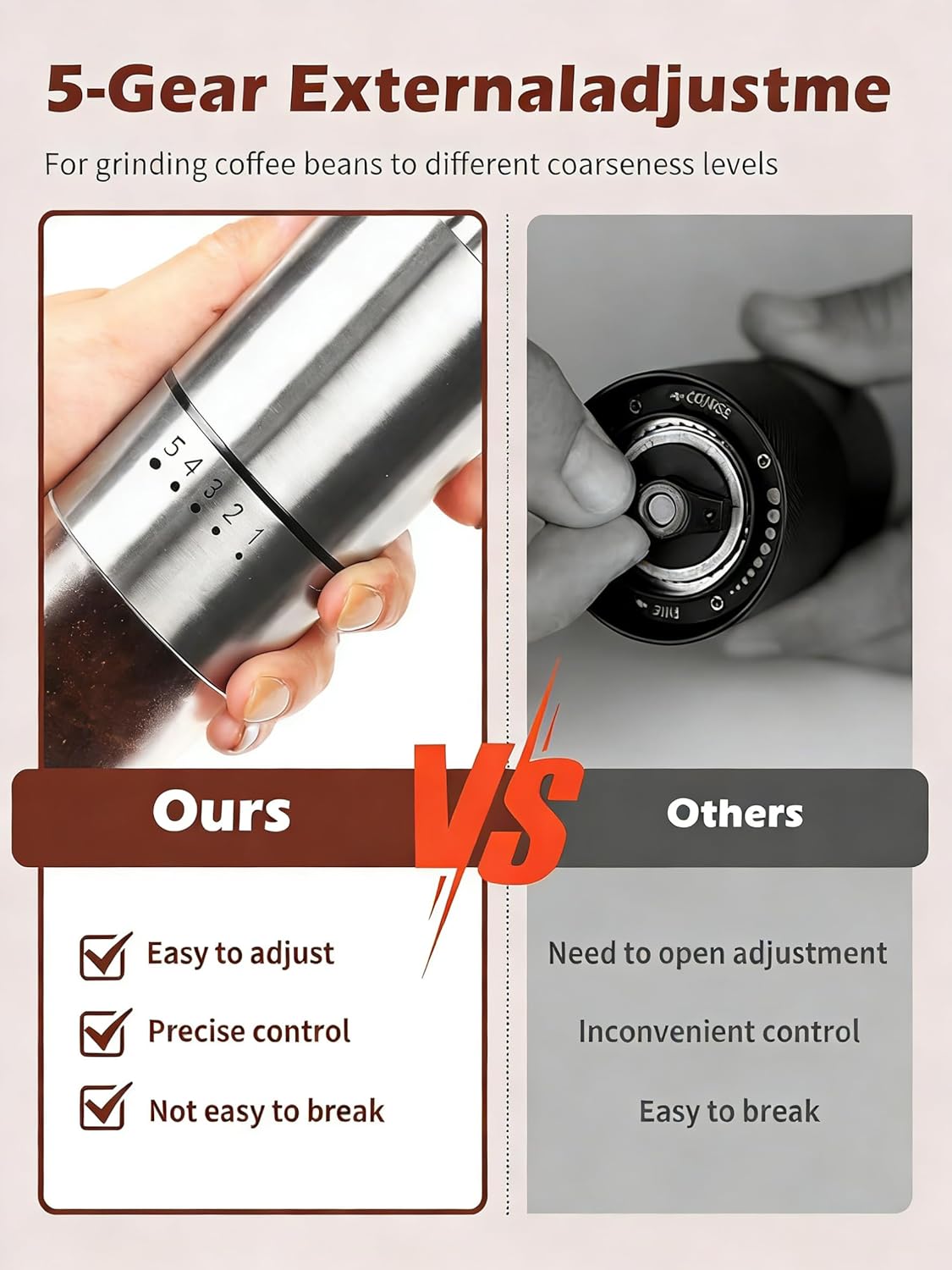 Manual Coffee Grinder With Ceramics Burr For Espresso, French Press, 5 Adjustable Settings, Stainless Steel Hand Mill with Built-In Burr, For Home Use and Camping (Sliver)