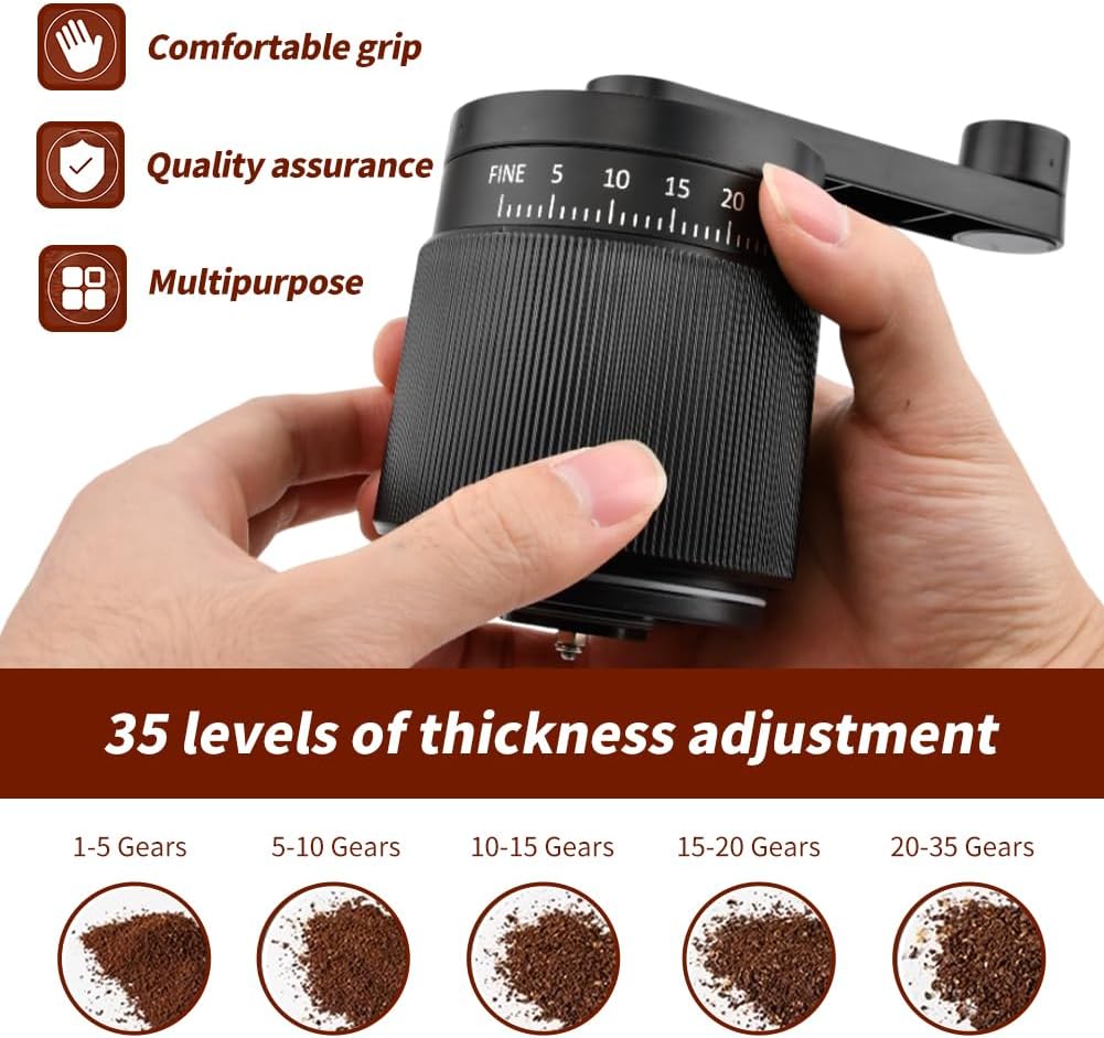 ​【35+ Precise Grind Settings & Top Dial】Achieve cafe-quality consistency in seconds, from fine espresso to coarse French press. The externally mounted top adjustment knob allows you to change grind settings effortlessly without disassembling the grinder, making it ideal for coffee enthusiasts who value versatility and simplicity.
