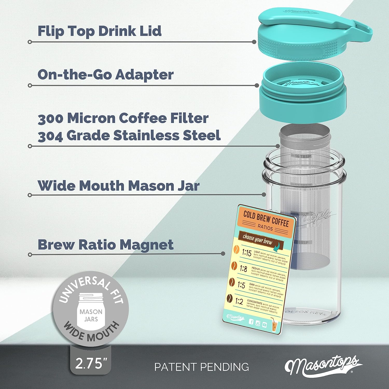 Masontops Cold Brew Kit is the easiest and most versatile cold brew system on the market. Experience the simplicity of brewing your favorite coffee or loose-leaf tea effortlessly. Just fill the chamber with your preferred ingredients (tablespoon measurements on the brew chamber help to achieve the perfect flavor balance), add cold water, and let the magic brew unfold. With the Flip Top Drink Lid, pouring, storing, or enjoying your cold brew straight from the jar has never been easier. This kit is designed to seamlessly fit into any kitchen or fridge space, catering to your lifestyle, whether you prefer to enjoy your cold brew at home or take it on the go. No expertise needed! This is the only kit that includes a handy kitchen magnet with a Cold Brew Ratio Guide, ensuring that anyone can create a delicious cold brew coffee. This kit will quickly become one of your favorite coffee accessories!