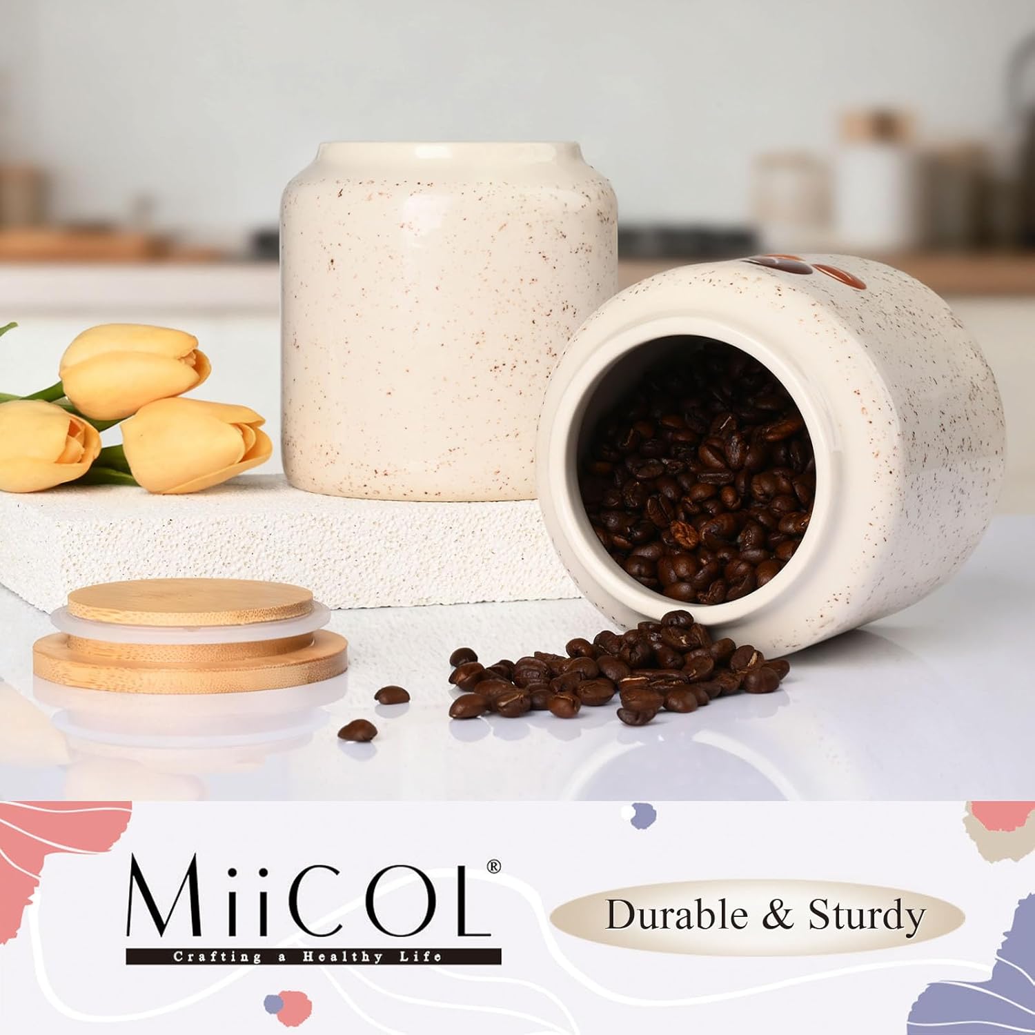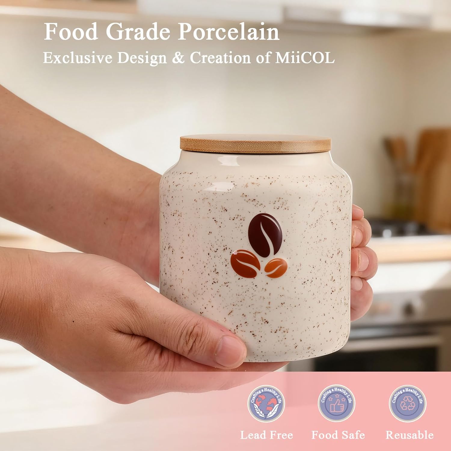 Versatile Storage: The MiiCOL ceramic canister measures 4.13″ L x 4.13″ W x 4.72″ H, with a capacity of 600 mL / 20 US fl oz. It can hold approximately 7.4 avoirdupois oz (210 g) of coffee beans. Please note that the actual holding capacity may vary depending on the type and particle size of contents like coffee beans or tea leaves