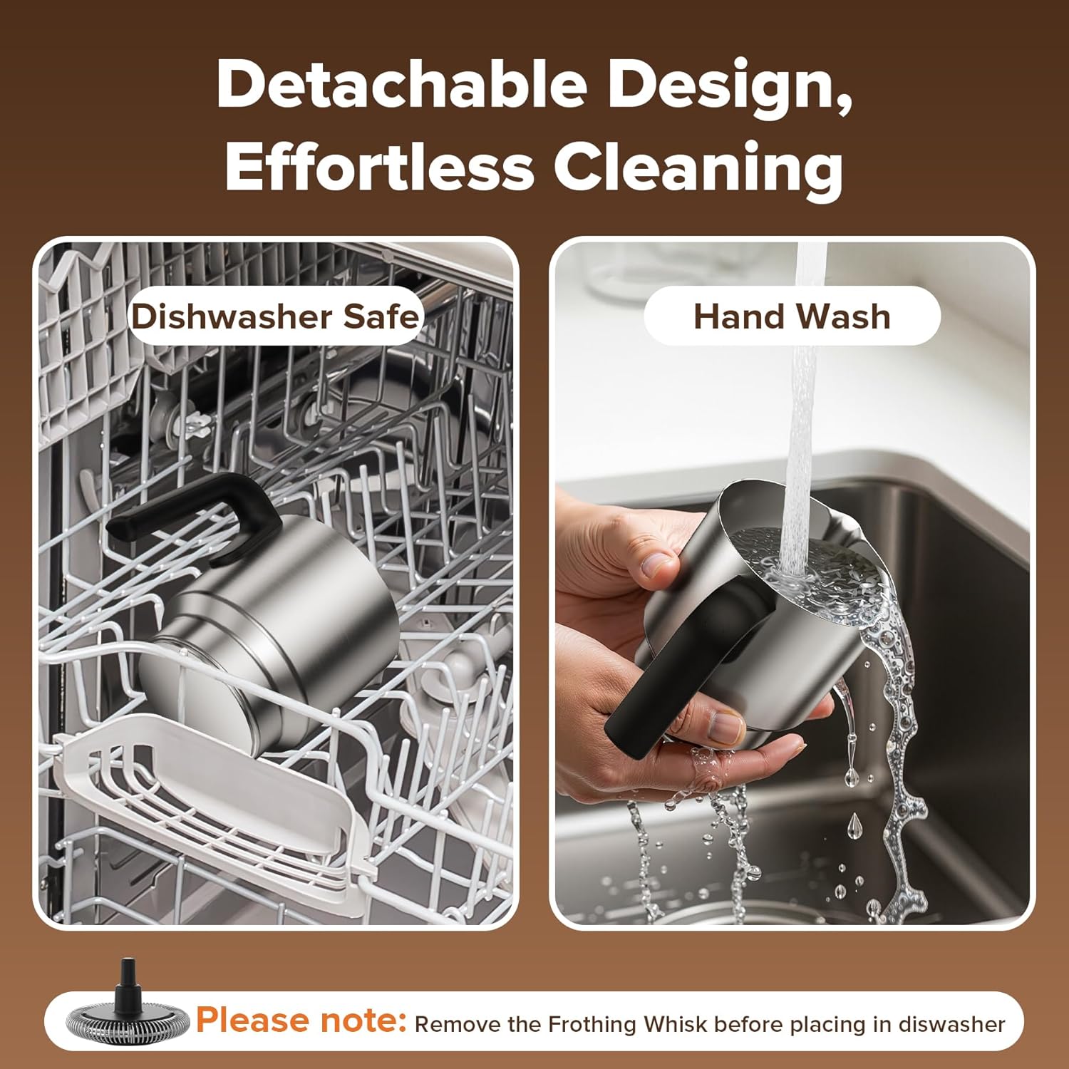 【The Ultimate Easy-Clean Design: Fully Detachable】Cleaning is effortless. The entire stainless steel inner cup and the BPA-free spring whisk detach in one piece for a thorough, quick rinse under the tap. No hard-to-clean nooks or hidden parts.