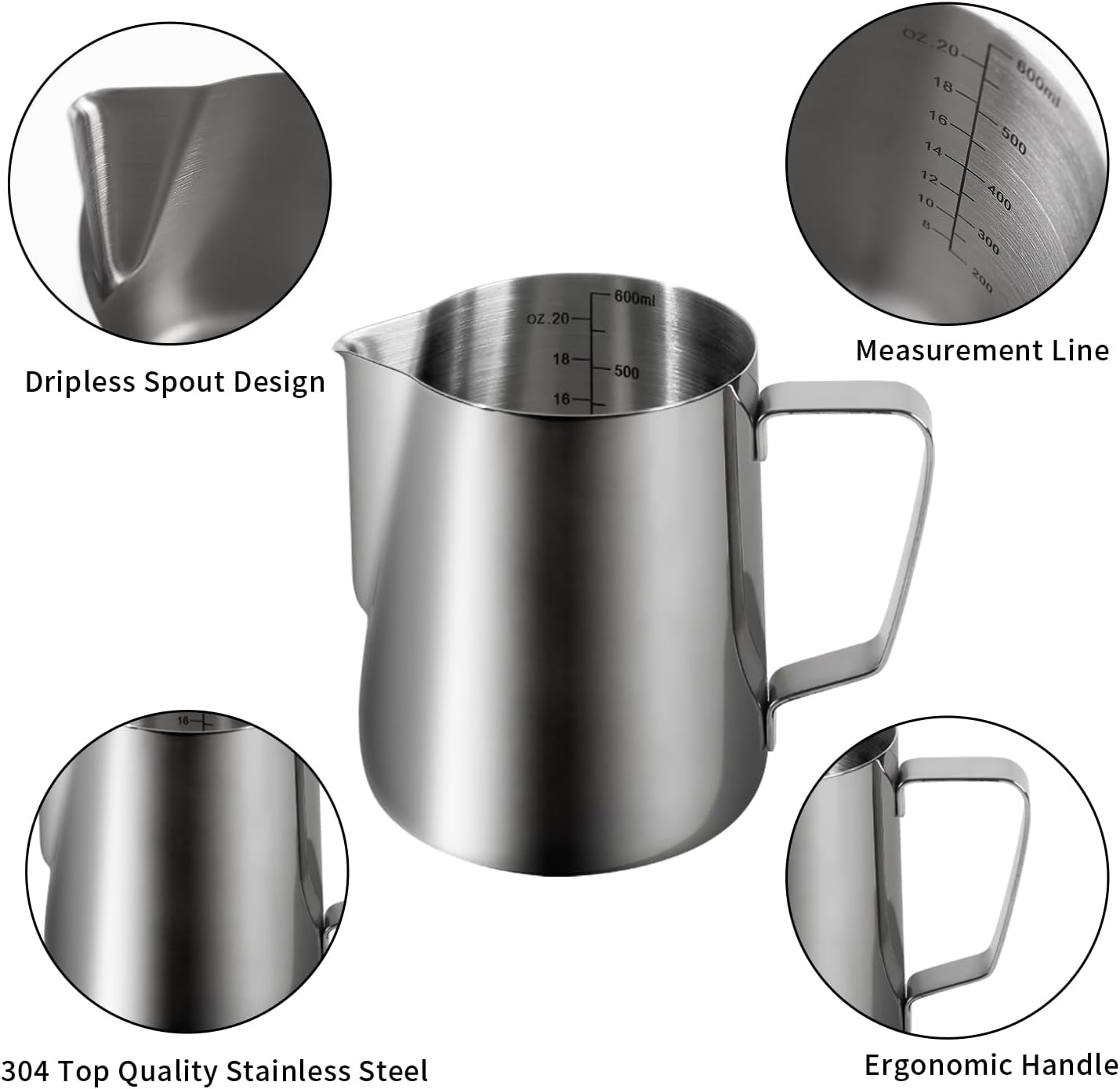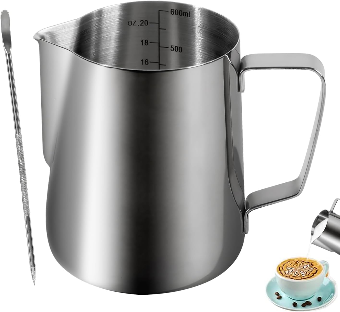 20OZ / 600ml. Create any shapes you want with steamed milk, this frothing cup helps you control the volume, speed and direction freely.