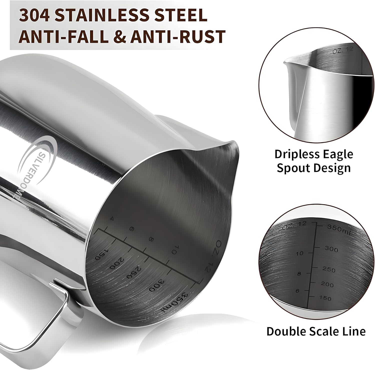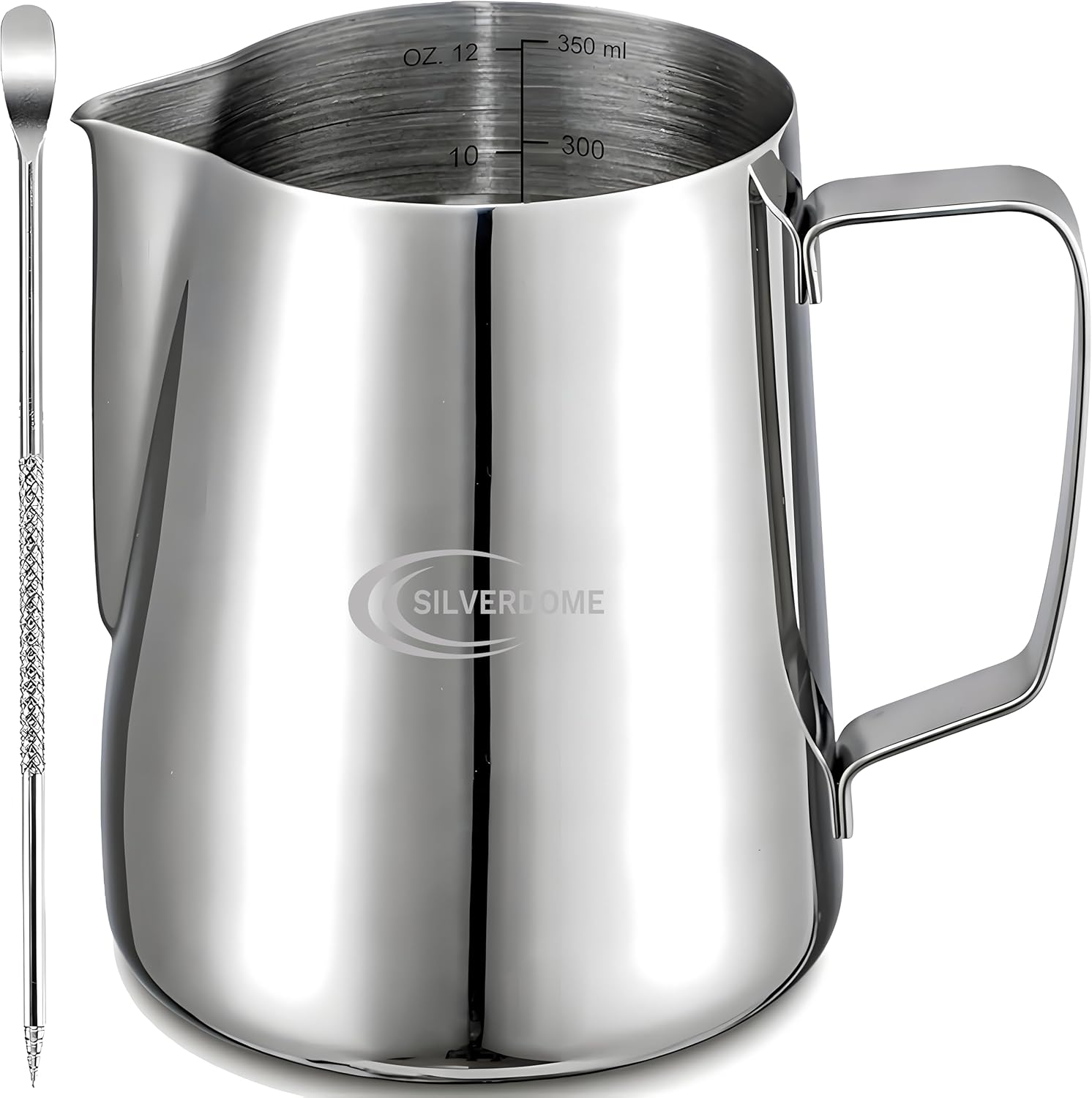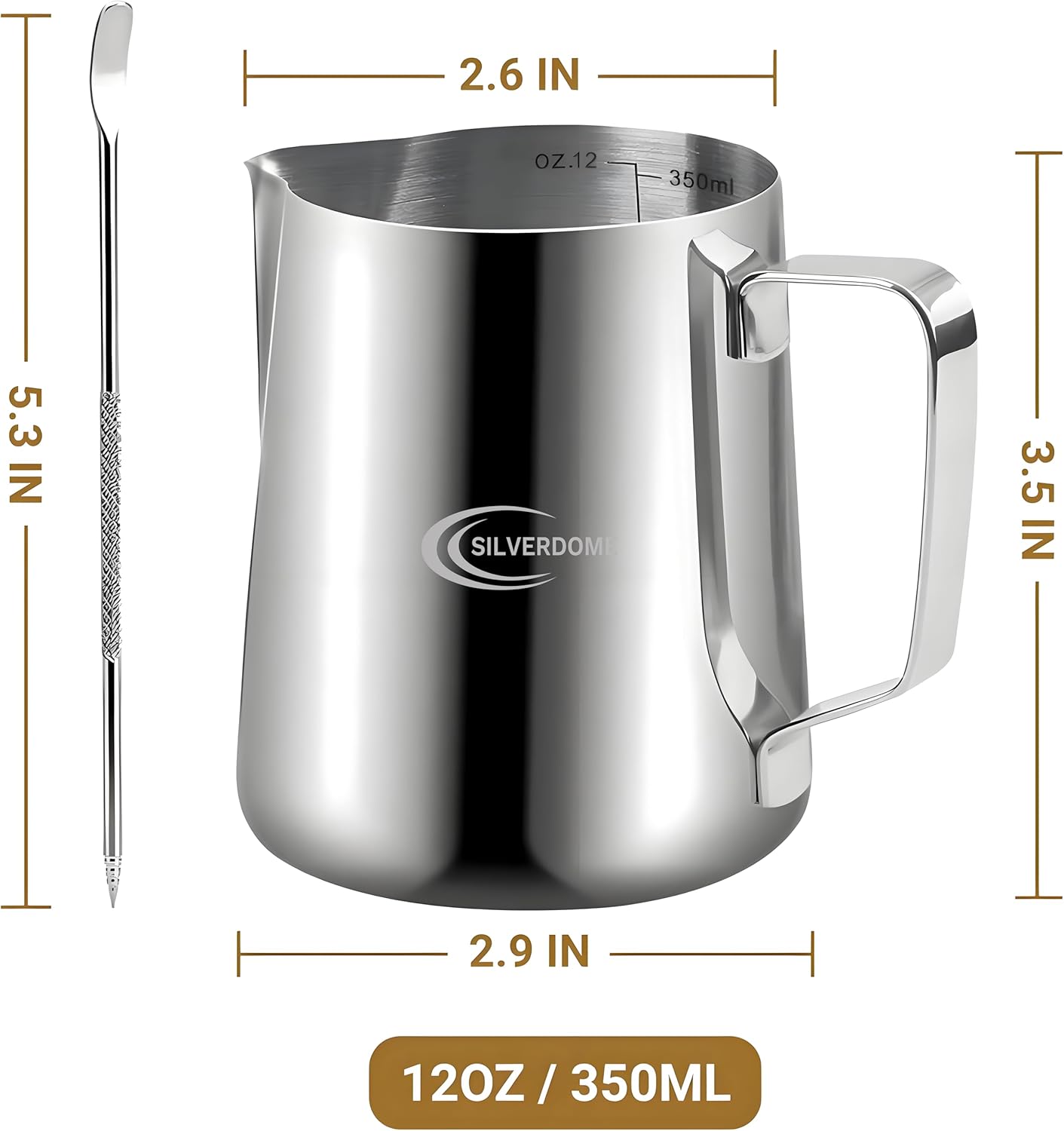 Elevate your barista skills with this premium 12 oz milk frothing pitcher from SILVERDOME. Crafted from high-quality stainless steel, this professional-grade pitcher is perfect for creating silky microfoam for lattes, cappuccinos, and other coffee beverages. The precisely engineered spout allows for controlled pouring, making it easier to achieve intricate latte art designs. With a capacity of 12 ounces (350ml), this pitcher is ideally sized for preparing 1-2 drinks at a time. The durable stainless steel construction ensures excellent heat retention while the ergonomic handle provides a comfortable, secure grip during use. The sleek, polished finish not only looks professional but is also easy to clean and maintain. Whether you’re a home enthusiast or professional barista, this frothing pitcher is an essential tool for crafting cafe-quality drinks.