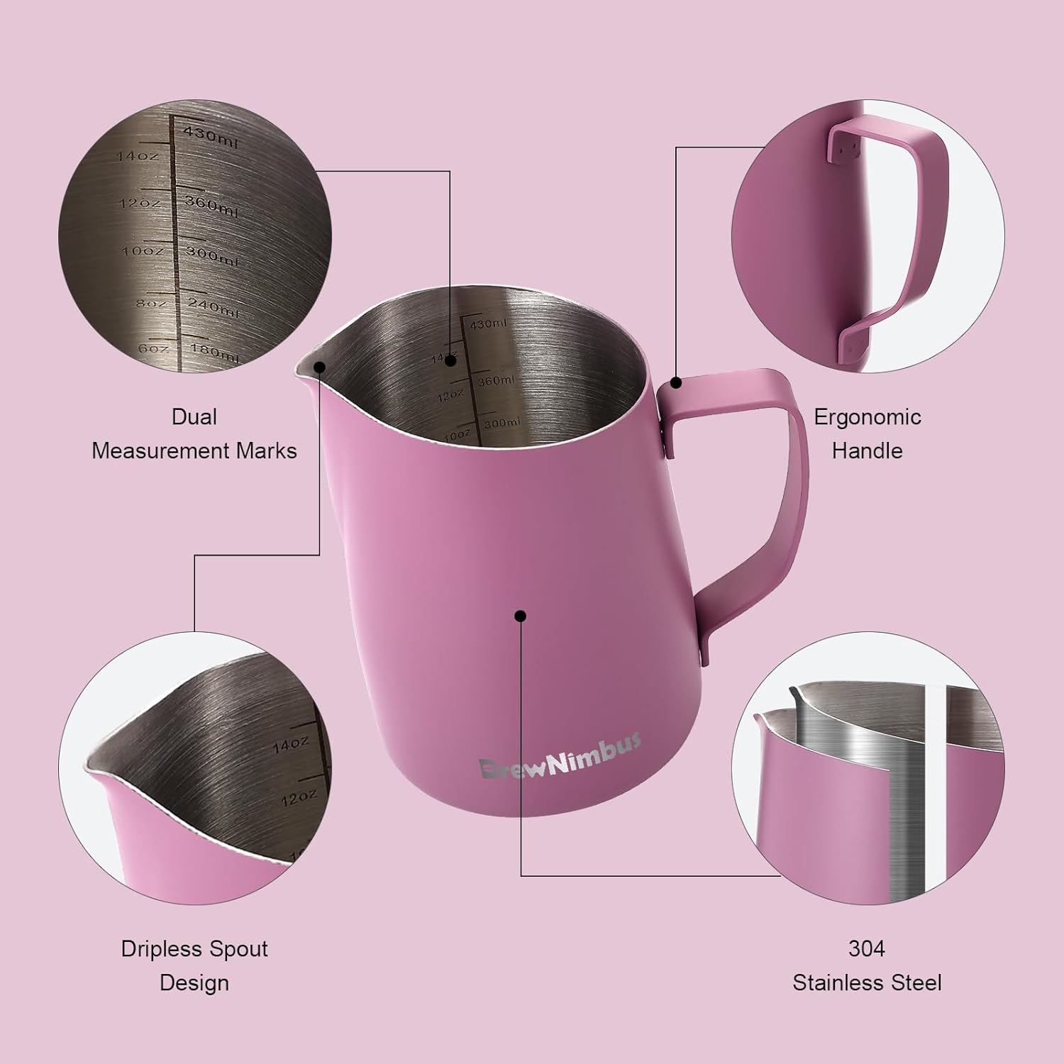 Internal Measuring Scale: Featuring internal scale lines, this milk steamer cup ensures accurate milk volume control. With a 430ml capacity, it’s ideal for making lattes (suitable for 6-10 oz cups). Versatile for measuring, and serving milk or cream