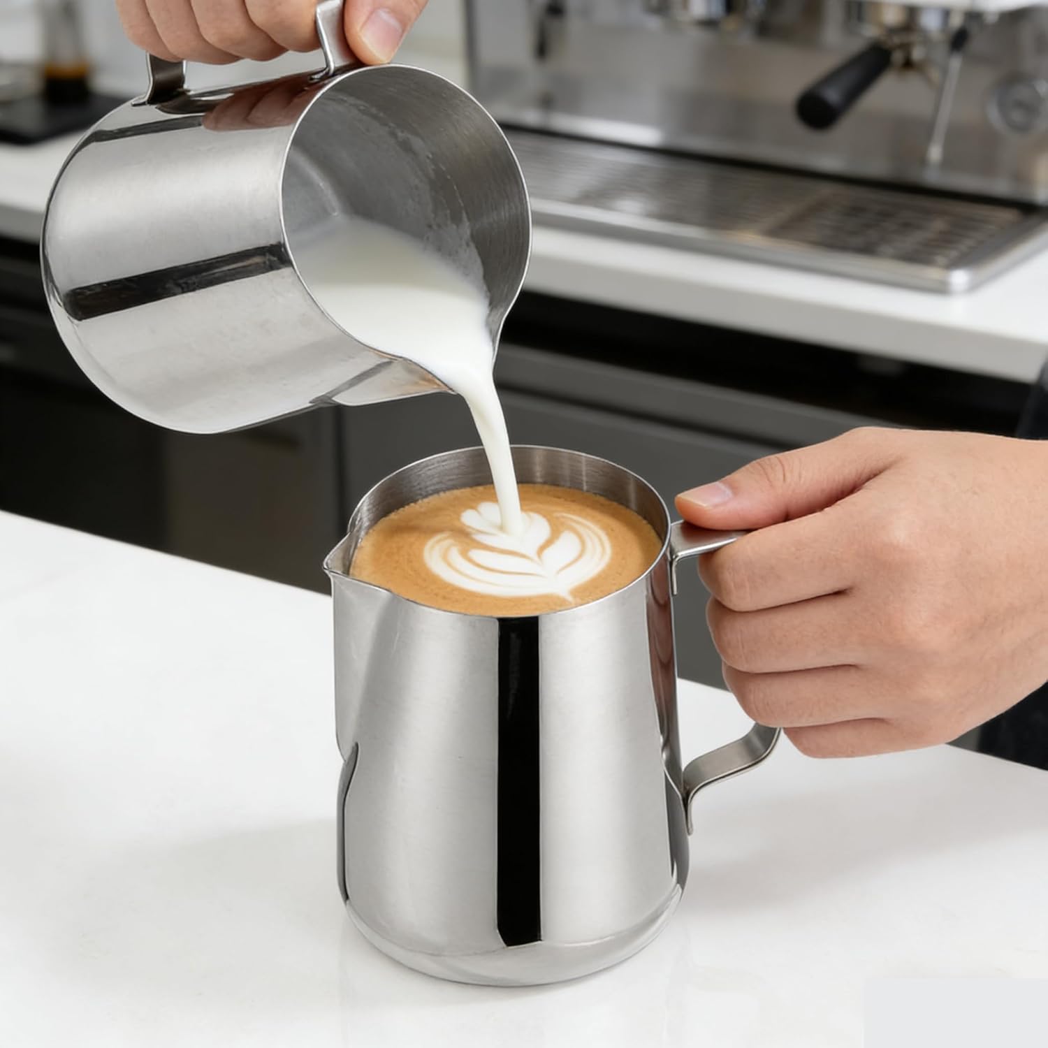 Elevate your coffee and latte art game with this premium 550ml stainless steel milk pitcher. The durable stainless steel construction provides excellent temperature retention while the ergonomic handle ensures comfortable pouring. Perfect for baristas and home coffee enthusiasts alike, this versatile pitcher allows for precise milk steaming and sophisticated latte art creation. The sleek, polished finish adds a touch of sophistication to any coffee station, while the sturdy construction stands up to daily use. The pitcher’s thoughtful design includes a tapered spout for controlled pouring and optimal foam manipulation. An essential tool for anyone serious about their coffee craft, this pitcher combines functionality with professional-grade durability.