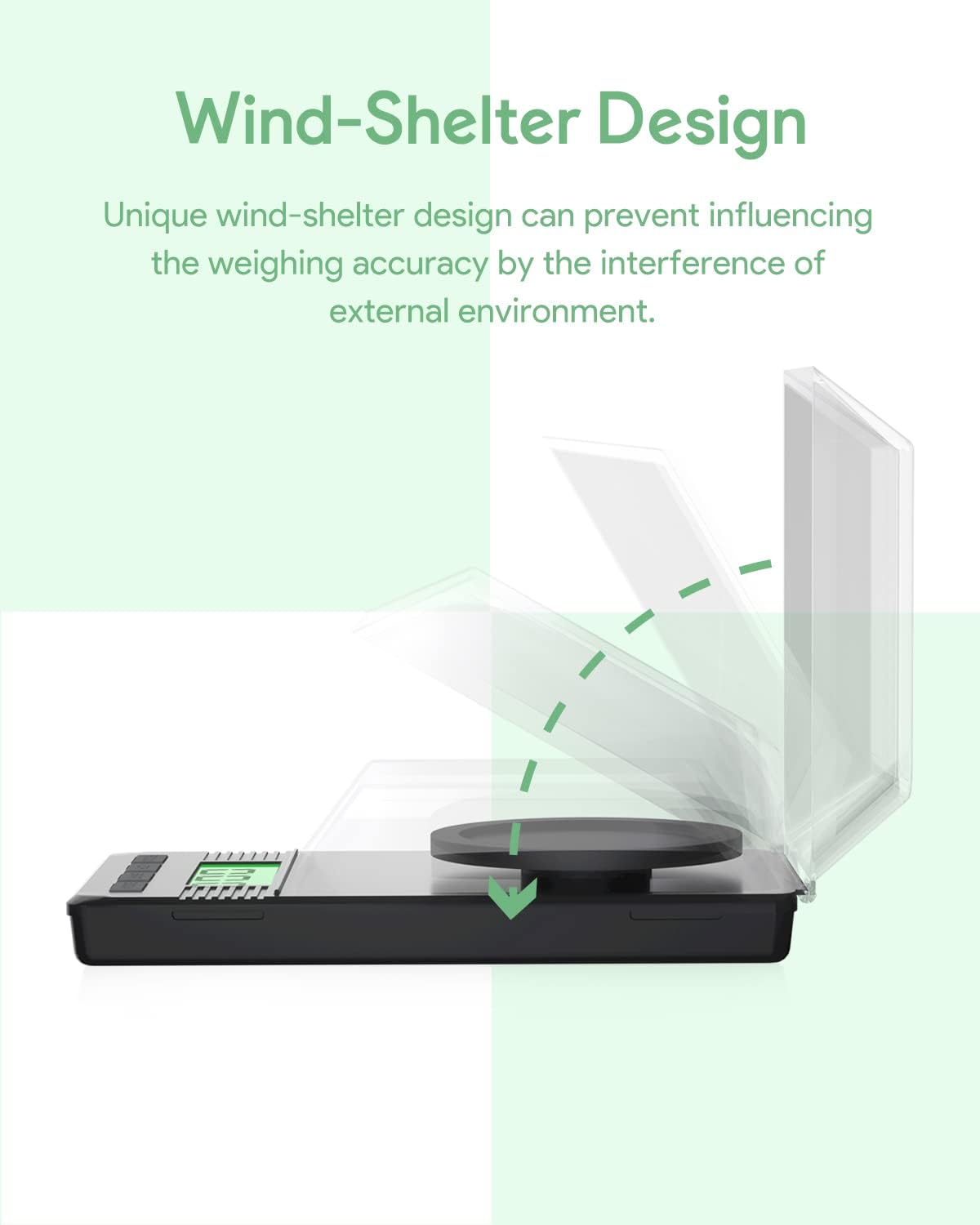 Wind-Shelter Design and Portable – Unique downward wind-shelter design can protect the precision weighing surface, preventing influencing the weighing accuracy by the interference of external environment. 50g calibration weight help you notice any inaccuracies on the digital scale during use; This digital scale is less than 5 inches in length and 3 inches in width.