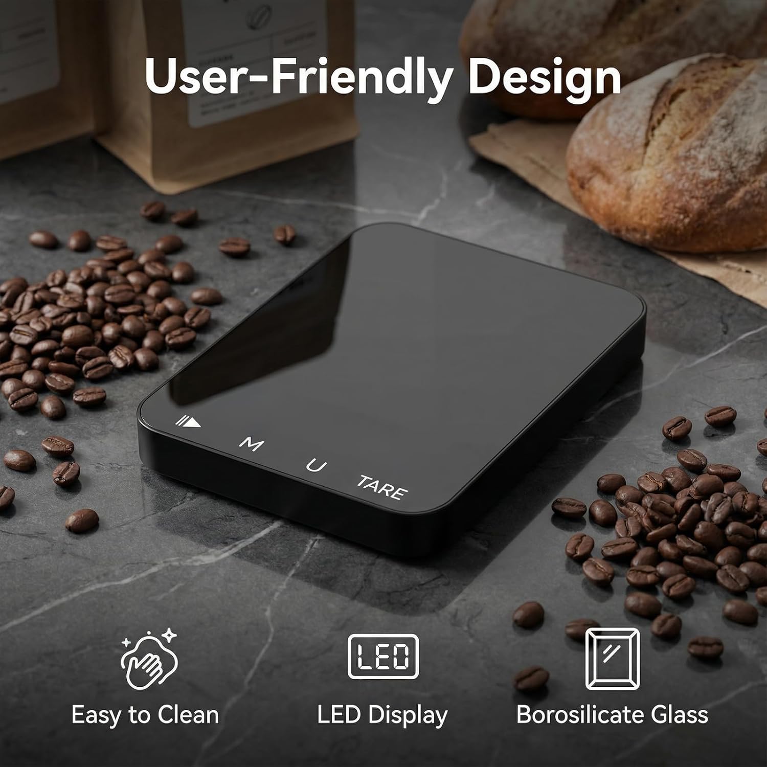 High Quality Material: The surface of the digital coffee scale is made of borosilicate glass, drop and heat resistant, easy to clean and maintain. It features touch-sensitive controls with a seamless surface that enhances aesthetics and ensures waterproof and easy cleaning