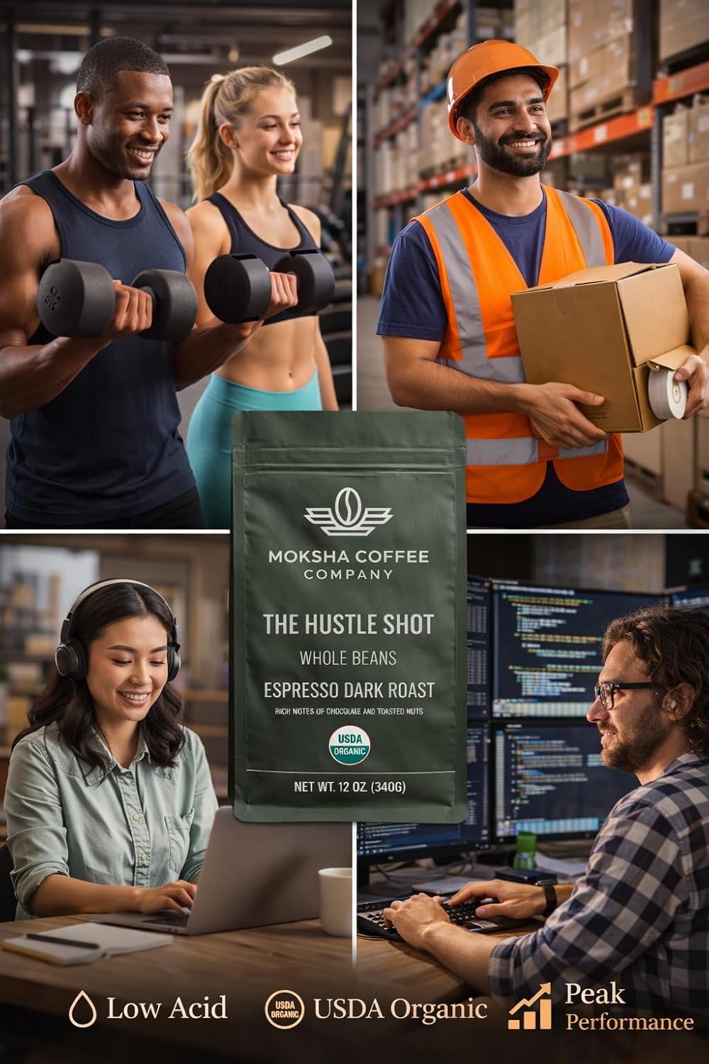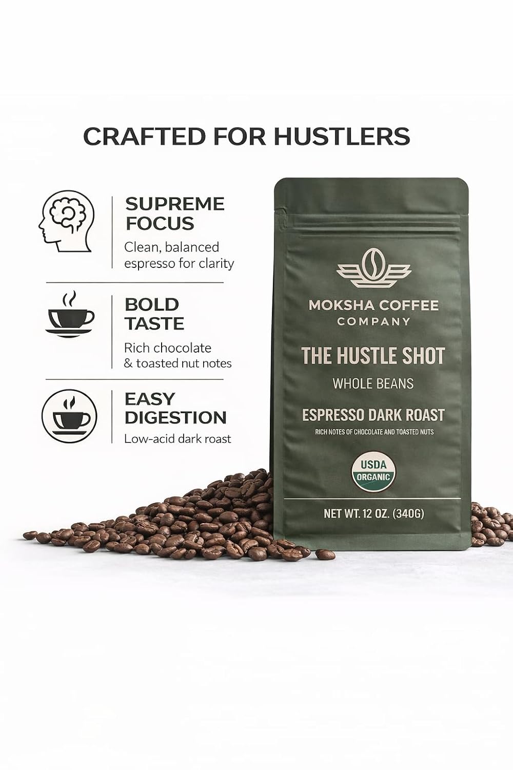 Crafted for hustlers — premium organic espresso dark roast espresso beans roasted for bold achievers, peak performers. Smooth, balanced flavor that powers your focus and keeps you moving.