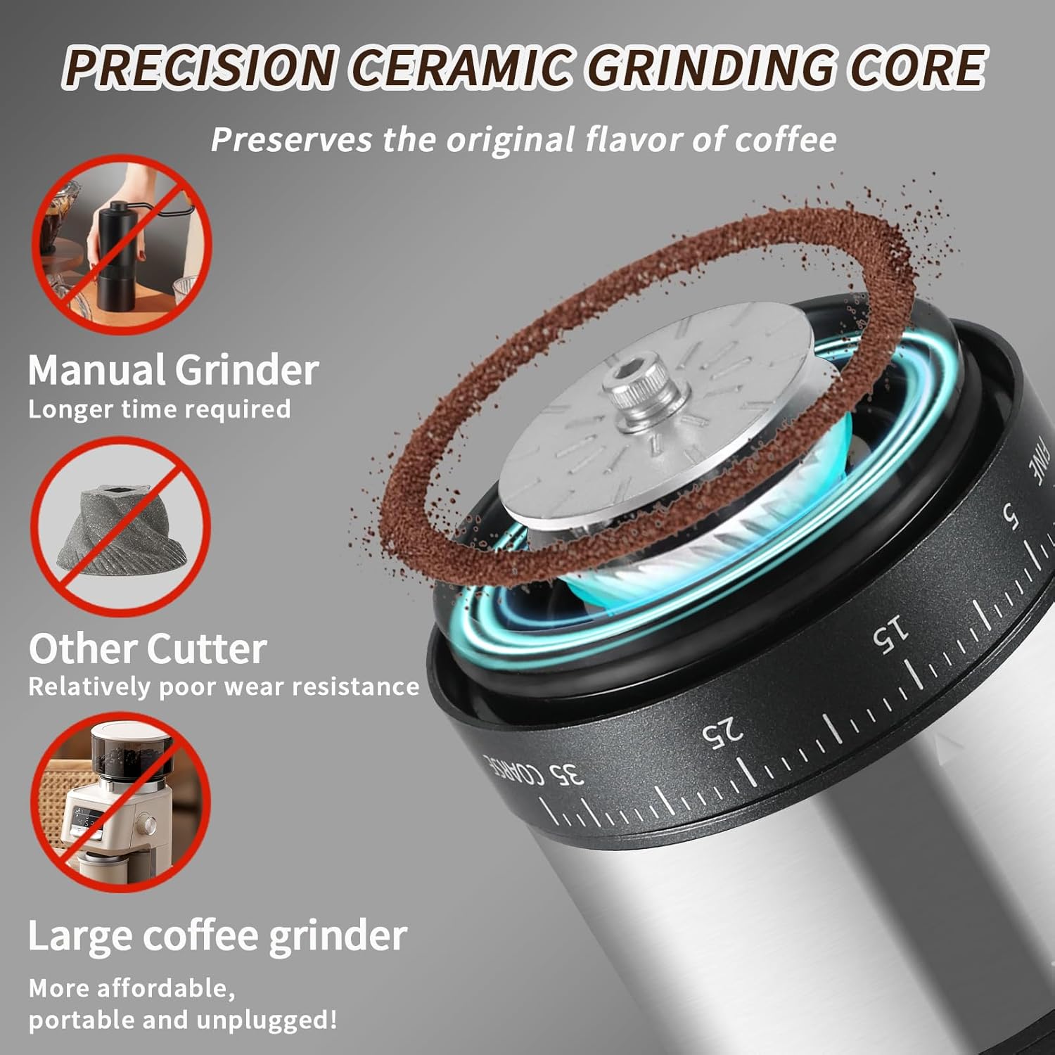 Mongdio Portable Electric Coffee Bean Grinder with 38 Adjustable Settings, Electric Burr Coffee Grinder Stainless Steel Core, For Traveling, Camping, Office, Silver
