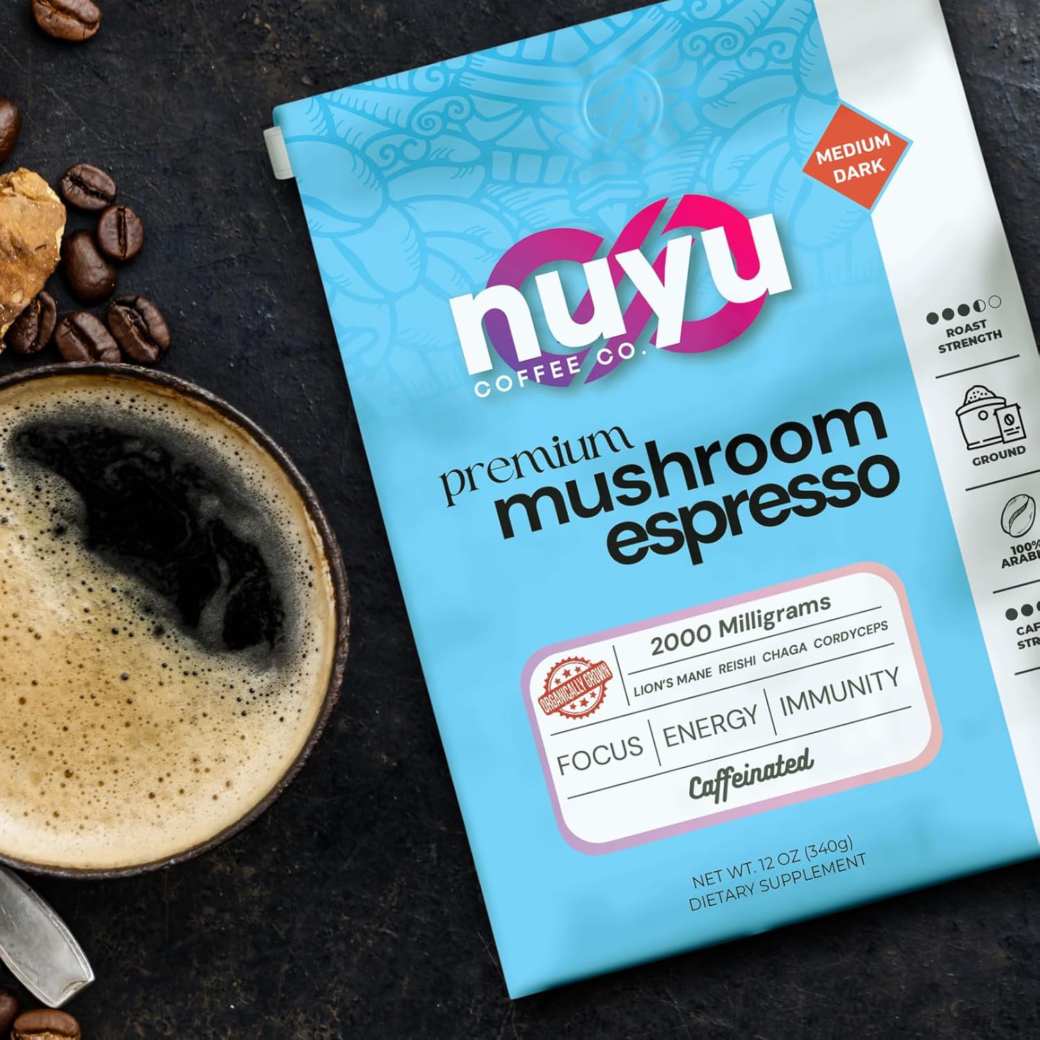 Nuyu Premium Mushroom Coffee, 12 oz, Fine Espresso Ground 100% Arabica, 2000mg Functional Mushrooms, Lion’s Mane, Reishi, Chaga, Cordyceps for Cognition, Energy and Wellness (12oz, Espresso Roast)