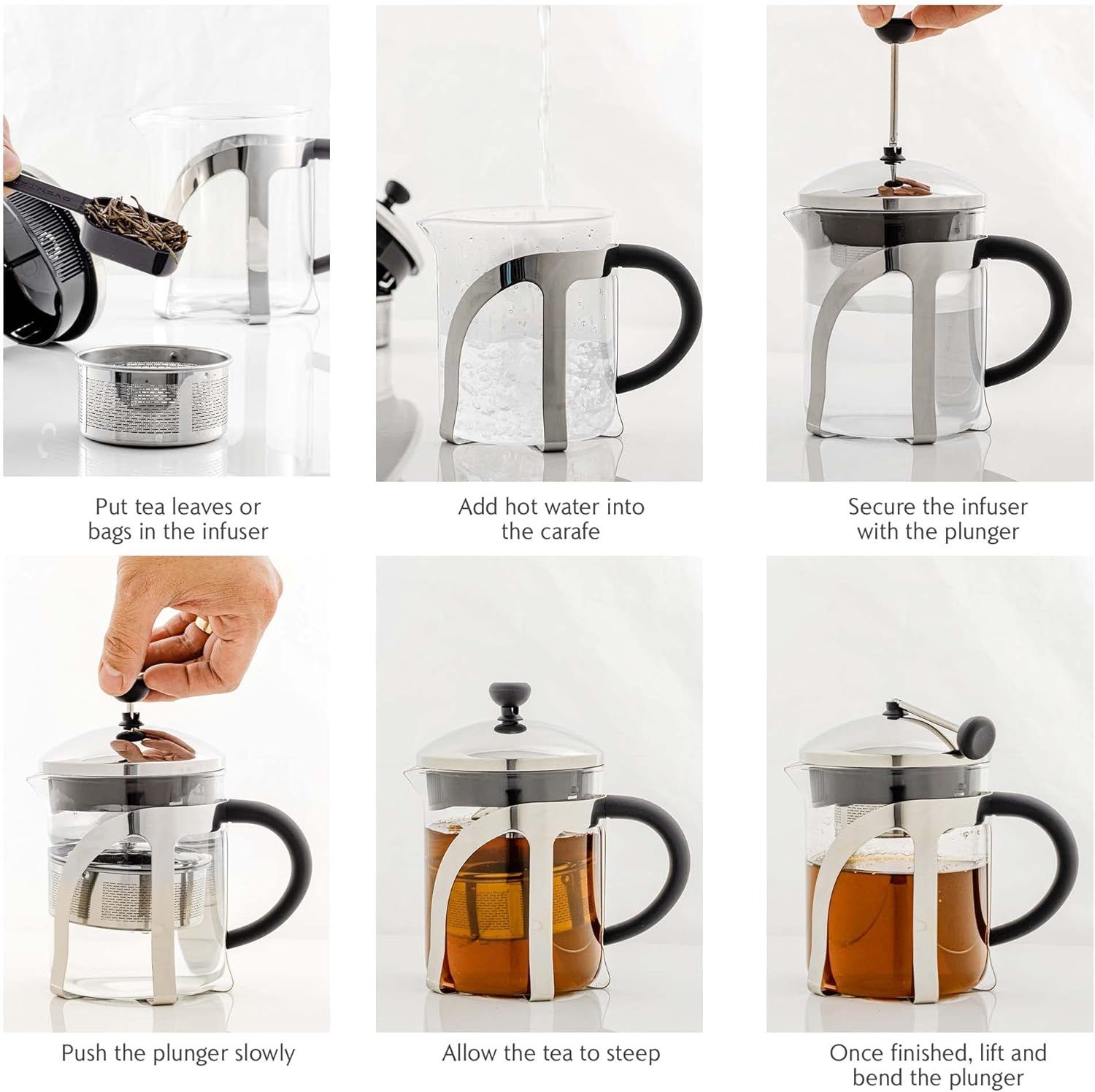 EASY TO USE – The interchangeable attachments are designed for effortless use. Simply switch between the tea infuser and the French press plunger without any hassle. The black silicone handle ensures a secure grip while keeping you safe from burns. Additionally, the glass carafe doubles as a pitcher, making it perfect for entertaining guests on any occasion.