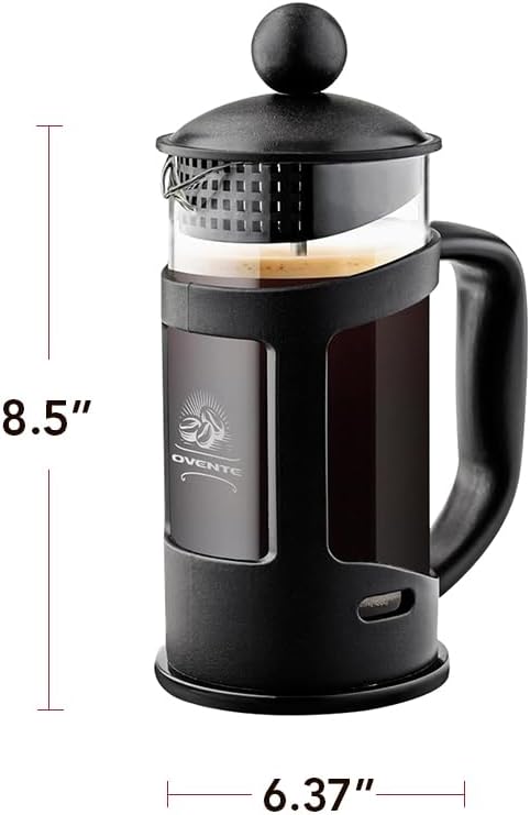 Be your own barista – Make your favorite coffee or tea at home Just like how the most scrumptious foods contain some oils and fats, the Ovente French Press works thoroughly to extract all the flavorful oils and bold, complex flavors that naturally occur in gourmet coffee beans. These flavor-enhancing oils are absorbed by the costly paper filters used with traditional coffee pots. The 3-part stainless steel plunging system uses a fine, stainless steel mesh filter to thoroughly extract all the succulent flavors from your coffee grounds, leaving you with a smooth cup of coffee with little to no waste. Beautifully packaged, they make excellent gifts, especially for workaholics, studious college students, and/or coffee and tea lovers! Composed of heavy-duty, heat-resistant and temperate borosilicate glass, its durable carafe is equipped with a sleek, ergonomically-designed protective shell, making it perfect for taking it with you to work, on vacation, and just about anywhere. You’re also not limited to just coffee or tea, this handy tool can be used to make espresso, yerba mate, lemonade, real hot chocolate, apple cider and almond milk too. And its versatility goes beyond just drinks—you can use it to wash grains, make chicken stock, strain frozen vegetables, create a unique terrarium, and infuse essential oils! Note: Always grind your coffee beans before use. Coarse grounds are better suited for this French press. Please be extremely careful when handling your press, especially when hot. Caution: Not for stovetop use.