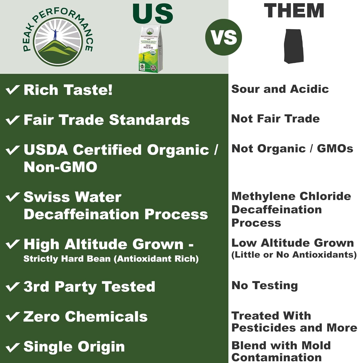 Peak Performance High Altitude Organic Decaf Coffee. Fair Trade, Low Acid, Non GMO, Beans Full Of Antioxidants. Medium Roast Smooth Tasting USDA Certified Organic Decaffeinated Whole Bean Coffee Bag
