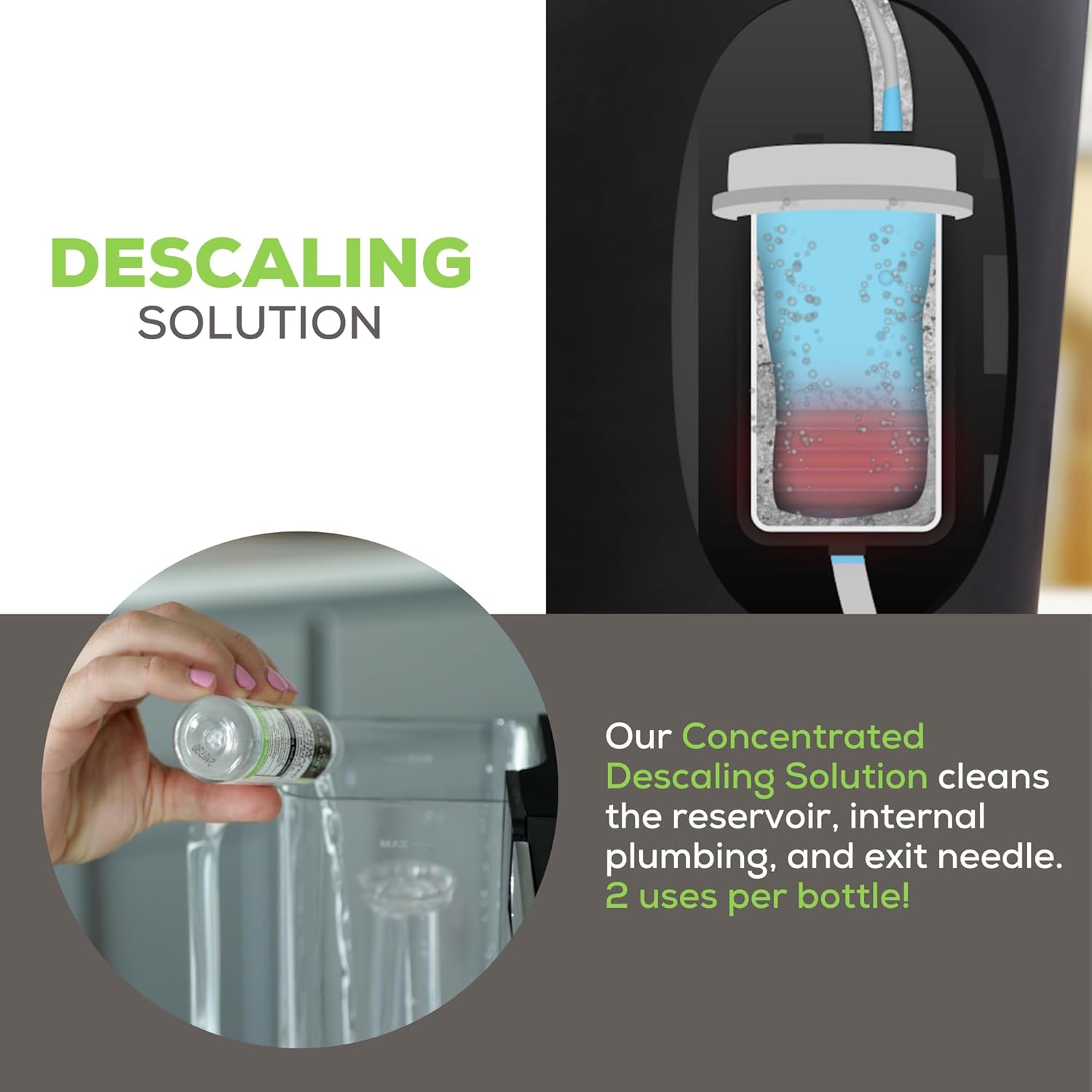 Descaling fluid food safe, no aftertaste, and Made in the USA. Two uses per bottle (2 bottles, 4 cleaning cycles), descale every 2-3 months for best results.