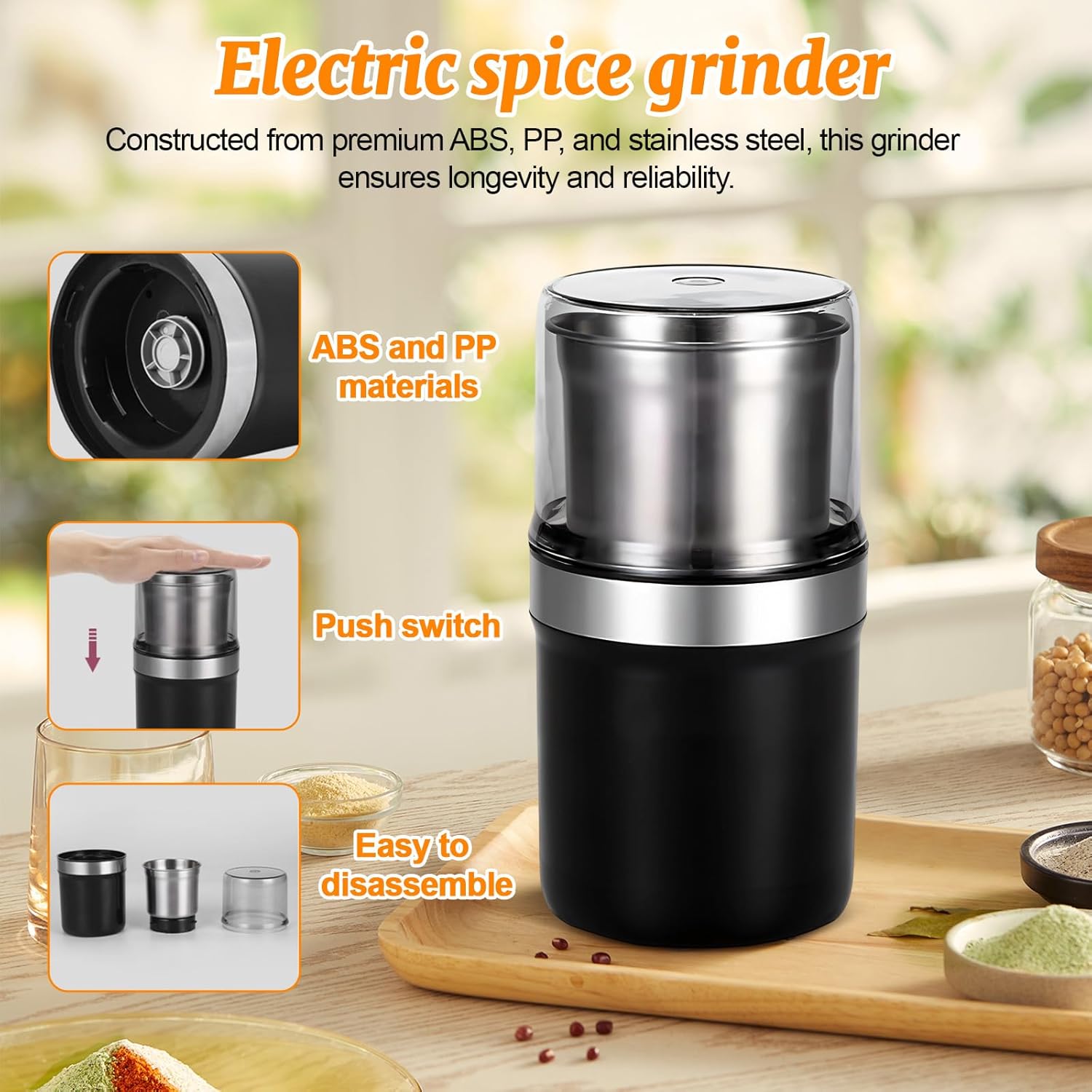 EASY OPERATION: The electric coffee grinder offers a user- friendly experience. Simply add your ingredients to the cup, secure the lid, and press down to start grinding. No complicated processes- just effortless cooking