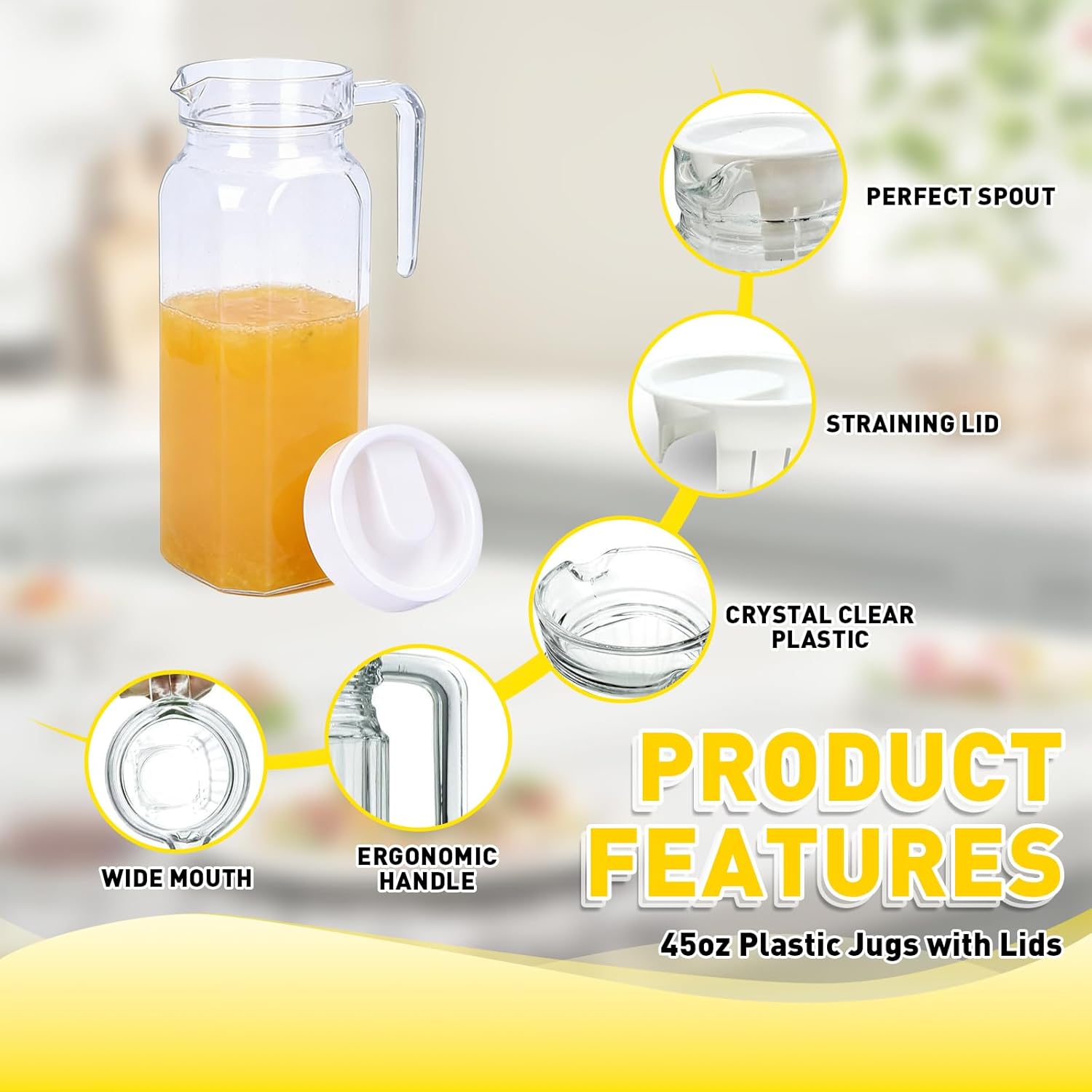 【Premium & Safe Material】: Crafted from high-quality plastic polycarbinate, these pitchers are BPA-free.They meet food safety standards and will not alter the taste of your beverages. The sturdy construction resists cracking and thermal shock, suitable for temperatures from -40°F to 212°F, ensuring durability for hot or cold drinks