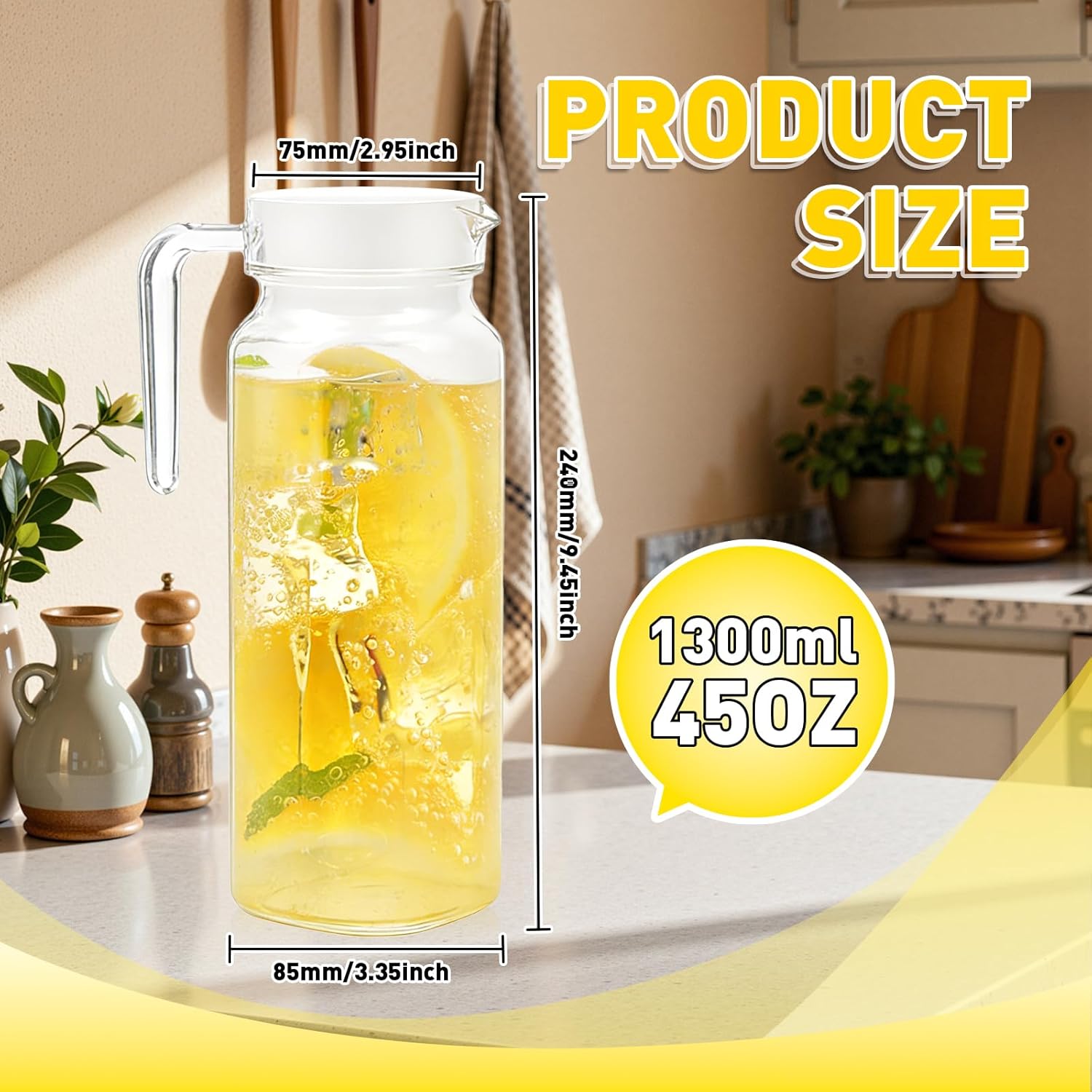 【Large Capacity & Versatile Design】: This juice pitcher includes three stylish designs—striped, square, and octagonal—each with a generous 1300ml capacity. Perfect for families, parties, or daily use, it holds enough for 4-6 servings. The included lids keep drinks fresh and prevent spills, making it ideal for juice, tea, lemonade, sangria, and more. Its compact size fits easily in refrigerators or on countertops