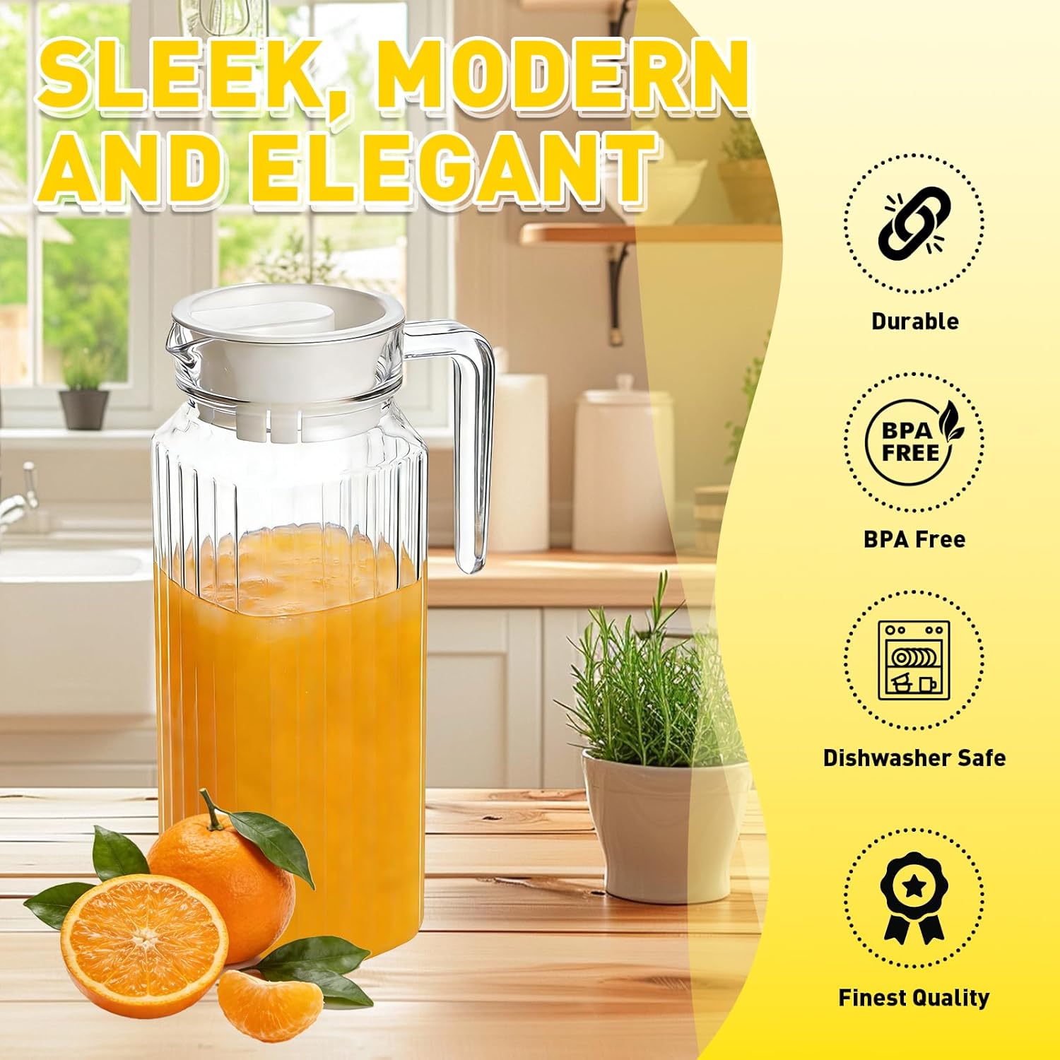 ②Thoughtful Design for Everyday Convenience Each pitcher comes with a secure, snap-on lid that keeps dust out and freshness in. The ergonomic handle provides a comfortable grip, while the precision spout ensures smooth, drip-free pouring. The sleek designs—striped for a classic look, square for modern appeal, and octagonal for unique style—add a touch of elegance to any setting. Plus, they are compact size for easy storage, saving space in your cupboard or fridge.