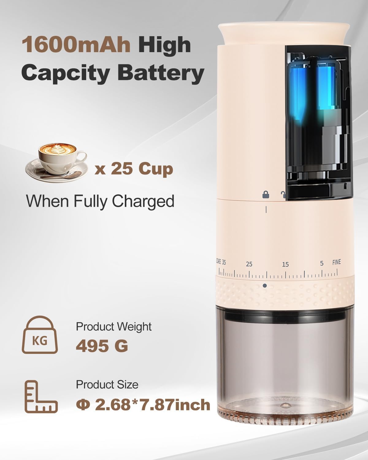 Battery Display Panel: Providing real-time battery level monitoring to avoid unexpected power interruptions. Built-in 1600 mAh rechargeable battery, enjoy up to 25 grinding sessions on a single full charge, with each session capable of grinding 25g of coffee beans. The grinder features a versatile Type-C charging port, allowing it to connect effortlessly to laptops, power banks, car chargers, and more. This cordless design makes it perfect for use at home, in the office, or while traveling, ensuring you’re never far from a fresh cup of coffee.