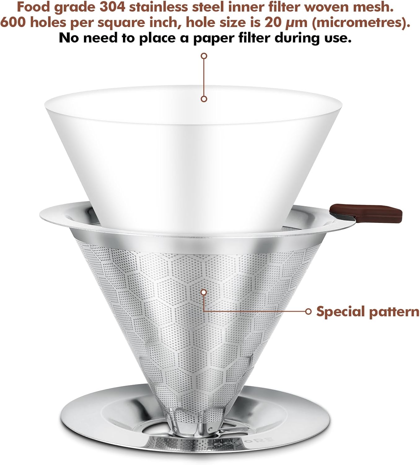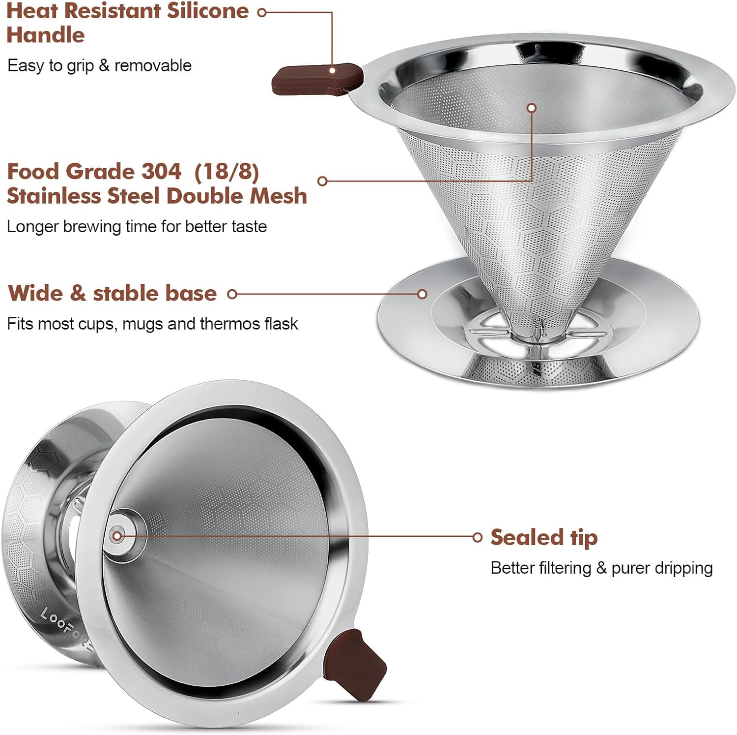 Double Mesh Design: The coffee filter is made of 304 food-grade stainless steel without using paper filters. The bottom is integrated with the filter element, solid and not break. The dual coffee dripper brewing design prevents any coffee grounds from passing, no grounds end up in your cup.
