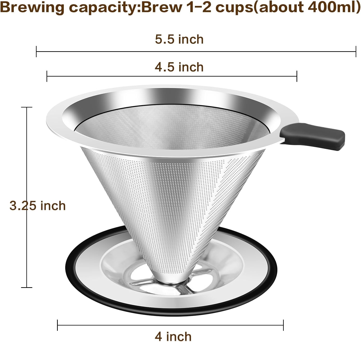 Pour Over Coffee Dripper, Stainless Steel Coffee Filter, Paperless Reusable Coffee Filter, Double Micromesh 600 Mesh Strainer Coffee Maker with Heat-Resistant Silicone Handle & Base