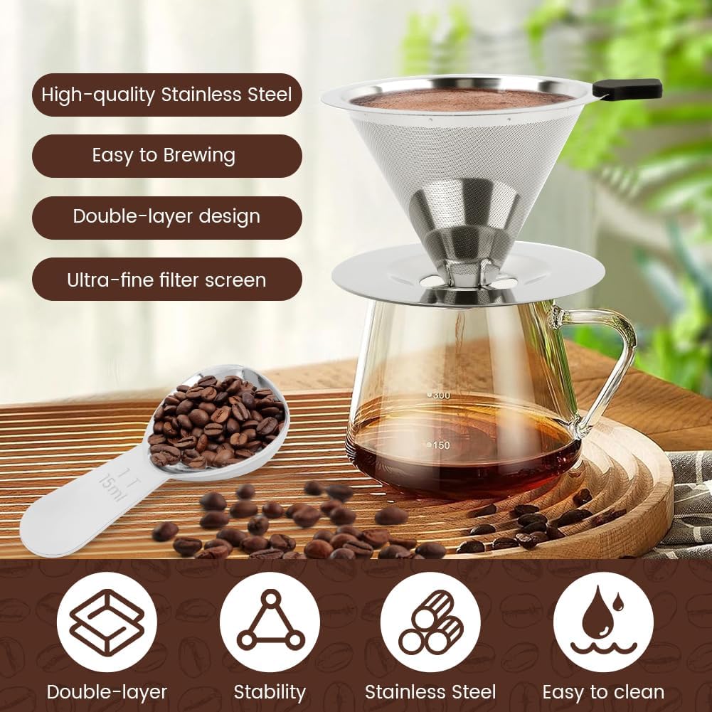 Pour Over Coffee Dripper,Upgraded Double Micro Mesh Filter With Cleaning Brush & 15g Measuring Scoop,Stainless Steel Reusable Coffee Filters Metal Cone-Filter Paperles(3-4cups)