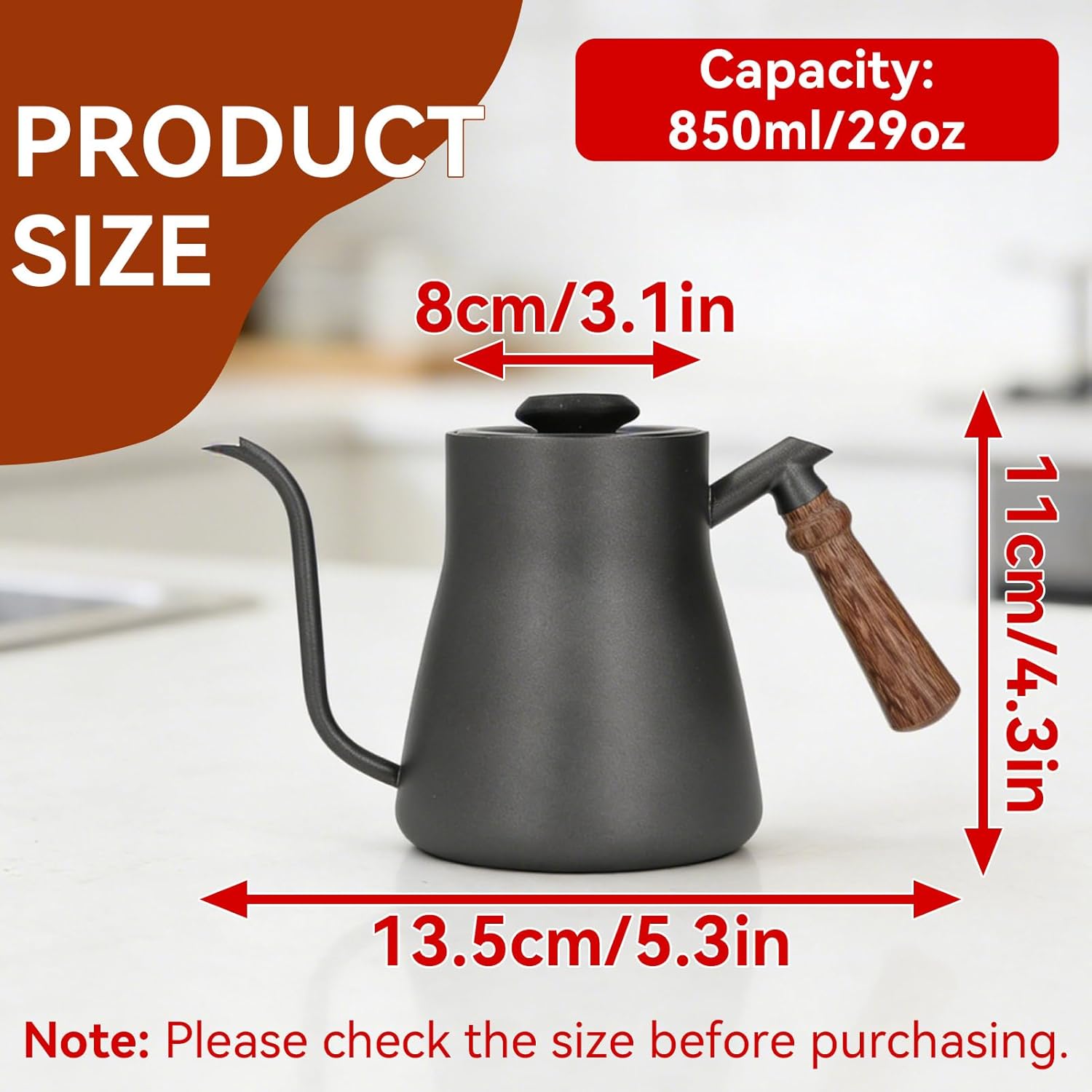850ml: Stainless steel gooseneck kettle small is made of stainless steel material, the coffee pot is stable. And the stainless steel coffee pot wood handle has a capacity of 850ml to meet the daily coffee making and drinking needs.