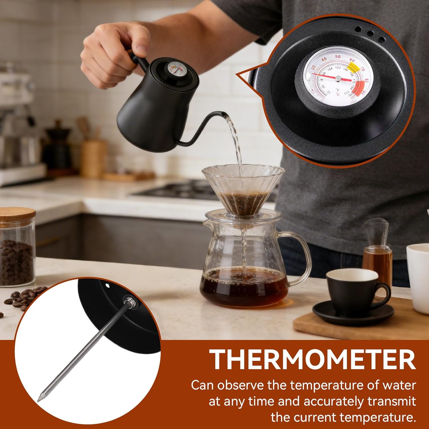 Versatile Usage: Designed for multiple heat sources, gooseneck kettle with thermometer is compatible with induction cooktops, gas stoves, ceramic hobs, and other common cooktops. Whether in home kitchens, offices, or professional cafes, stovetop gooseneck kettle is your ideal companion for pour-over coffee, brewing hot tea, or other precision brewing tasks