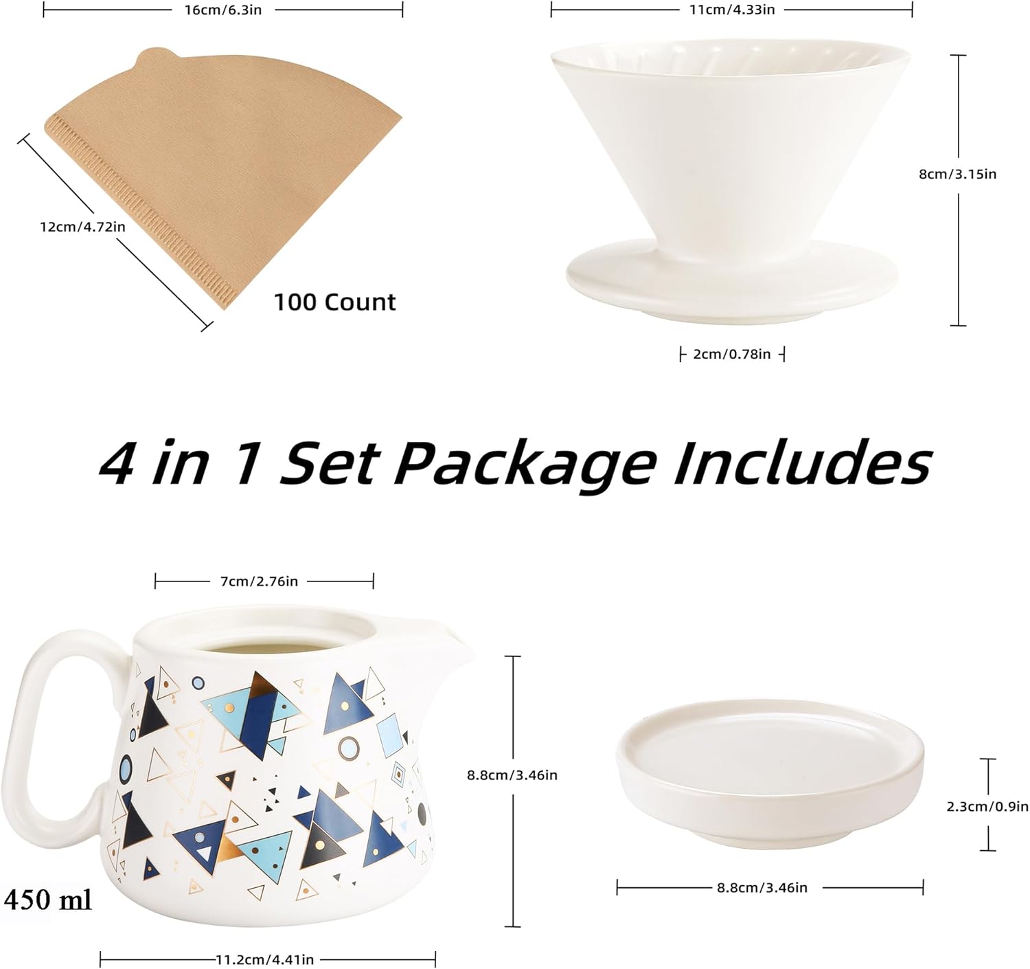Pour Over Coffee Maker, Ceramic Coffee dripper with 100 pcs V60 Paper Filter, Ceramic coffee Server with Lid, 15.5oz/450 ml, Suitable for 1-2 people (White A)