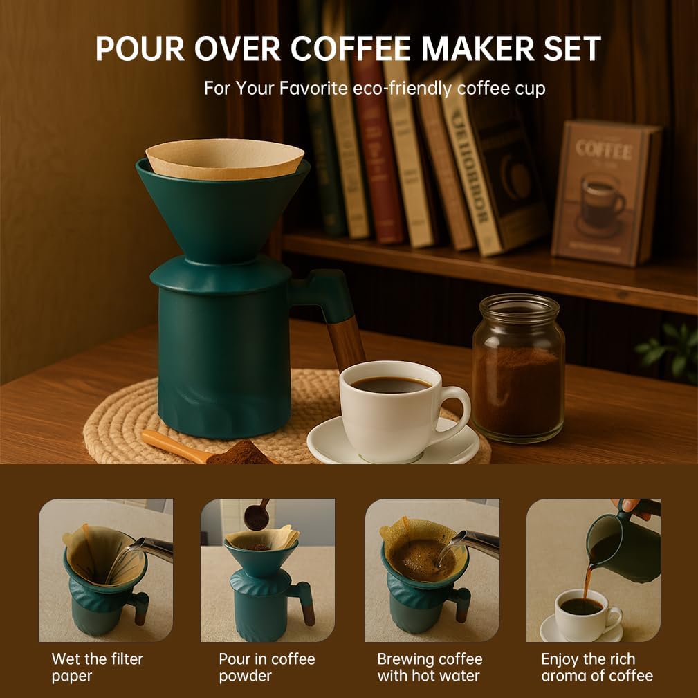 Complete Pour Over Coffee Makers Kit: Ready-to-use with filters & brush. Safe packaging + dedicated support—ideal for home, travel, campings, or gifting to coffee lovers