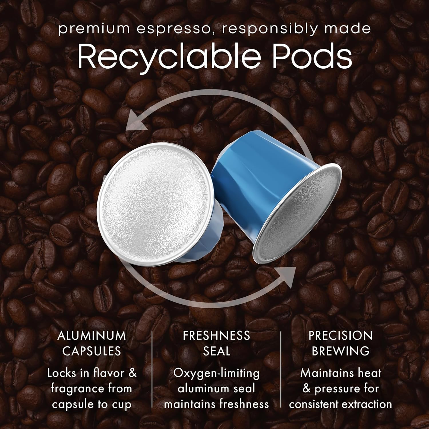 METAL PODS, NOT PLASTIC – Rigid aluminum coffee pods deliver stable heat and pressure during brewing, helping produce consistent espresso extraction and crema compared to flexible plastic pods.