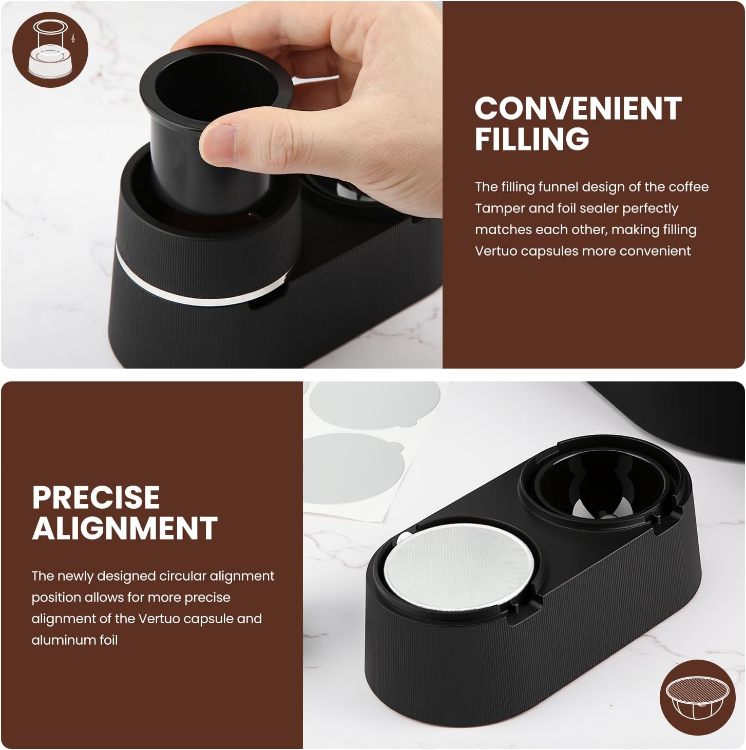 PERFECT SEAL: The Pro Mael refill kit’s newly designed foil sealer uses the same size design as the original Vertuo capsules, which allows for perfect pressing of the foil onto the Vertuo capsules.