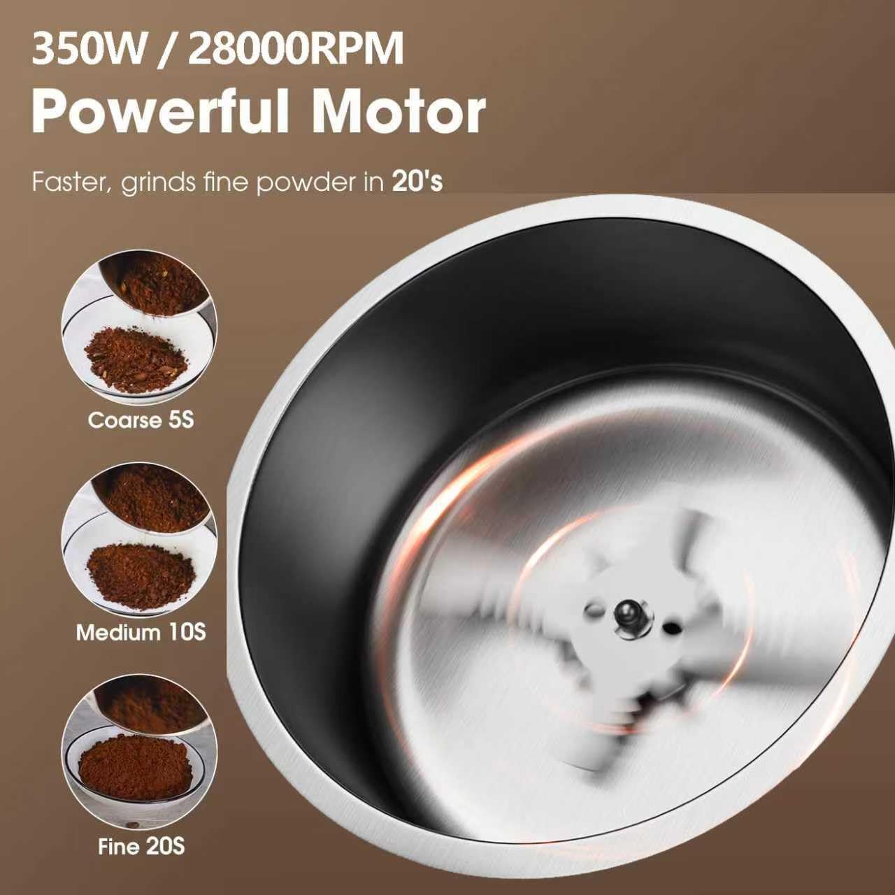 Equipped with a 350W motor running at 28,000 RPM, this grinder delivers fast and efficient performance. Achieve your desired texture in seconds — Coarse in 5s, Medium in 10s, Fine in 20s. Ideal for coffee beans, spices, nuts, and grains.Built to last with a stainless steel bowl and sharp blades, providing consistent grinding results and long-lasting use. The UL-listed plug and pure copper wire deliver