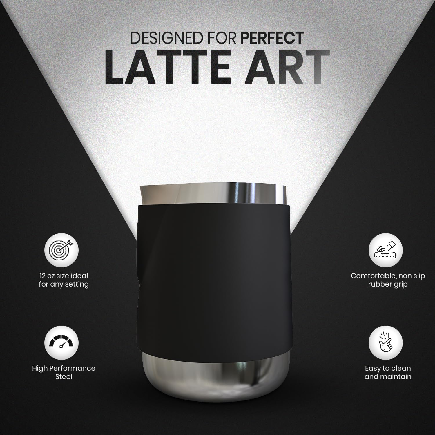𝐇𝐀𝐍𝐃𝐋𝐄-𝐅𝐑𝐄𝐄 𝐑𝐔𝐁𝐁𝐄𝐑 𝐖𝐑𝐀𝐏 𝐅𝐎𝐑 𝐒𝐀𝐅𝐄𝐓𝐘: The pitcher is designed without a traditional handle. This pitcher features a secure rubber grip that insulates your hand from heat. The wrap provides a steady, slip-free hold, giving baristas precise control while steaming milk or pouring designs.