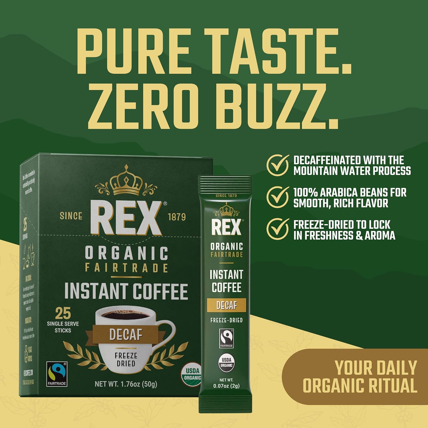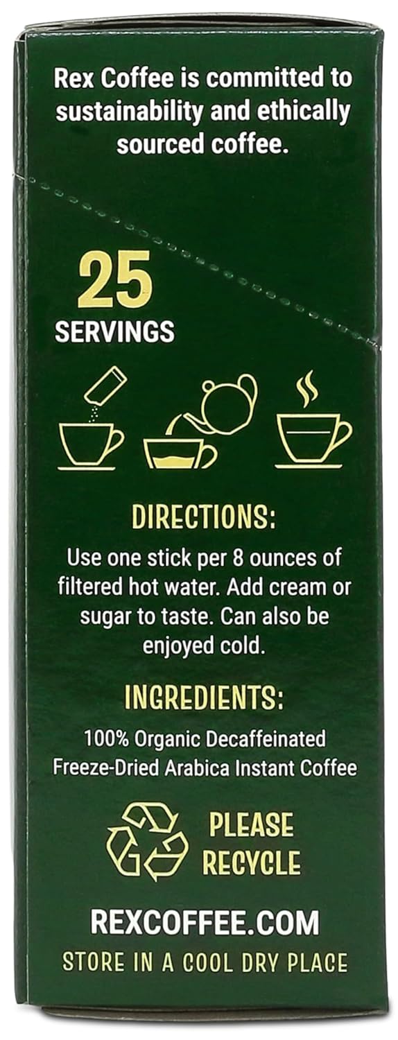 Rex Coffee Organic Fairtrade Decaf Freeze-Dried Instant Sticks – Naturally Decaffeinated Arabica, 25 Single-Serve Packs, Mountain Water Process