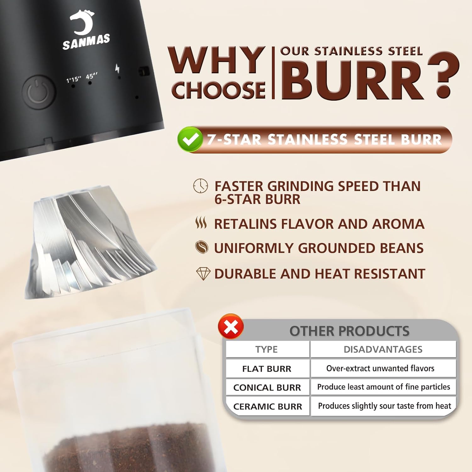 SANMAS ELECTRIC COFFEE GRINDER WITH STAINLESS STEEL BURR