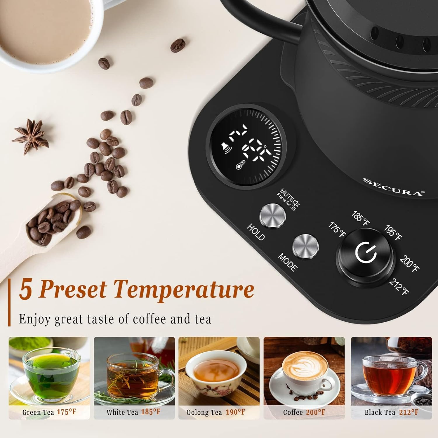 Secura Electric Gooseneck Kettle, 5 Variable Presets for Coffee Tea Brewing, 100% Stainless Steel Inner Tea/Coffee Kettle with 1.5H Keep Warm, 1200 Watt Quick Heating Pot, 0.8L, Matt Black