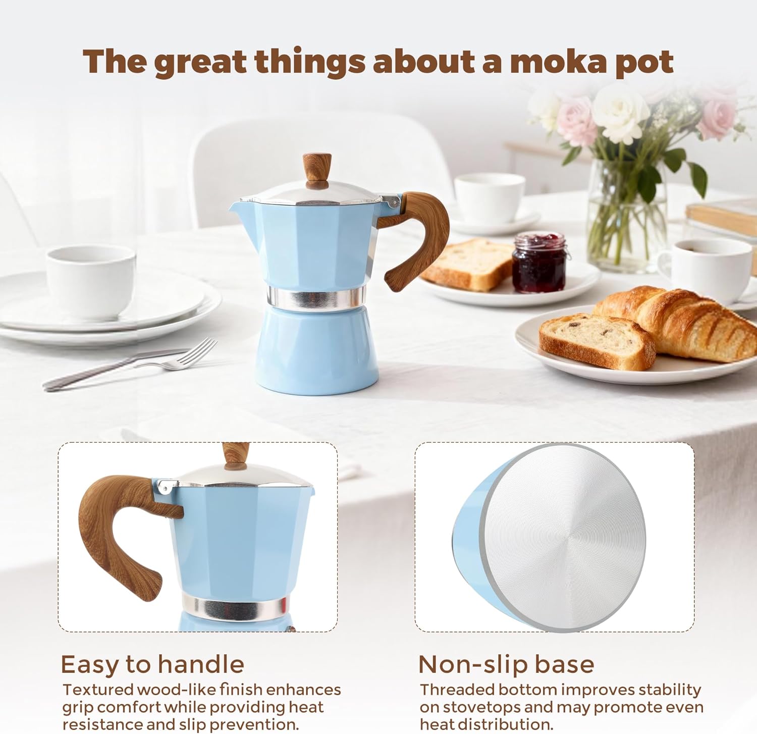 Safe & Hassle Free: Our Aluminum Stovetop Espresso Maker Moka Pot made with durable aluminum that keeps coffee warm. We gave the Stovetop Espresso maker moka pot a soft cool touch handle and safety valve to release excess steam for easy handling.