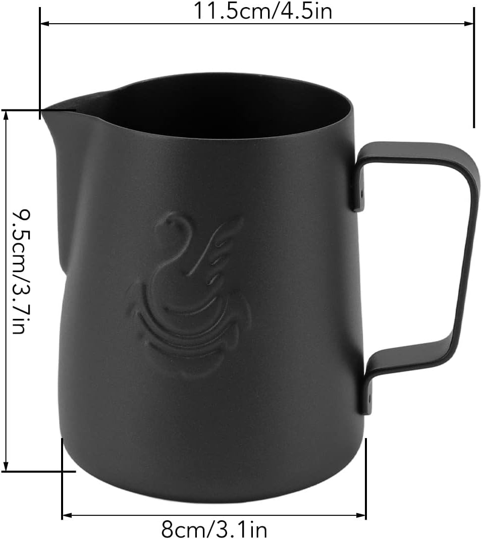 Stainless Steel Milk Frother Pitcher, 14oz Coffee Art Cup with Swan Design for Home Use, Cappuccino, Latte, and Coffee Art Creations by Coffee Enthusiasts and Professionals, 3.1 X 3.7in (Black)