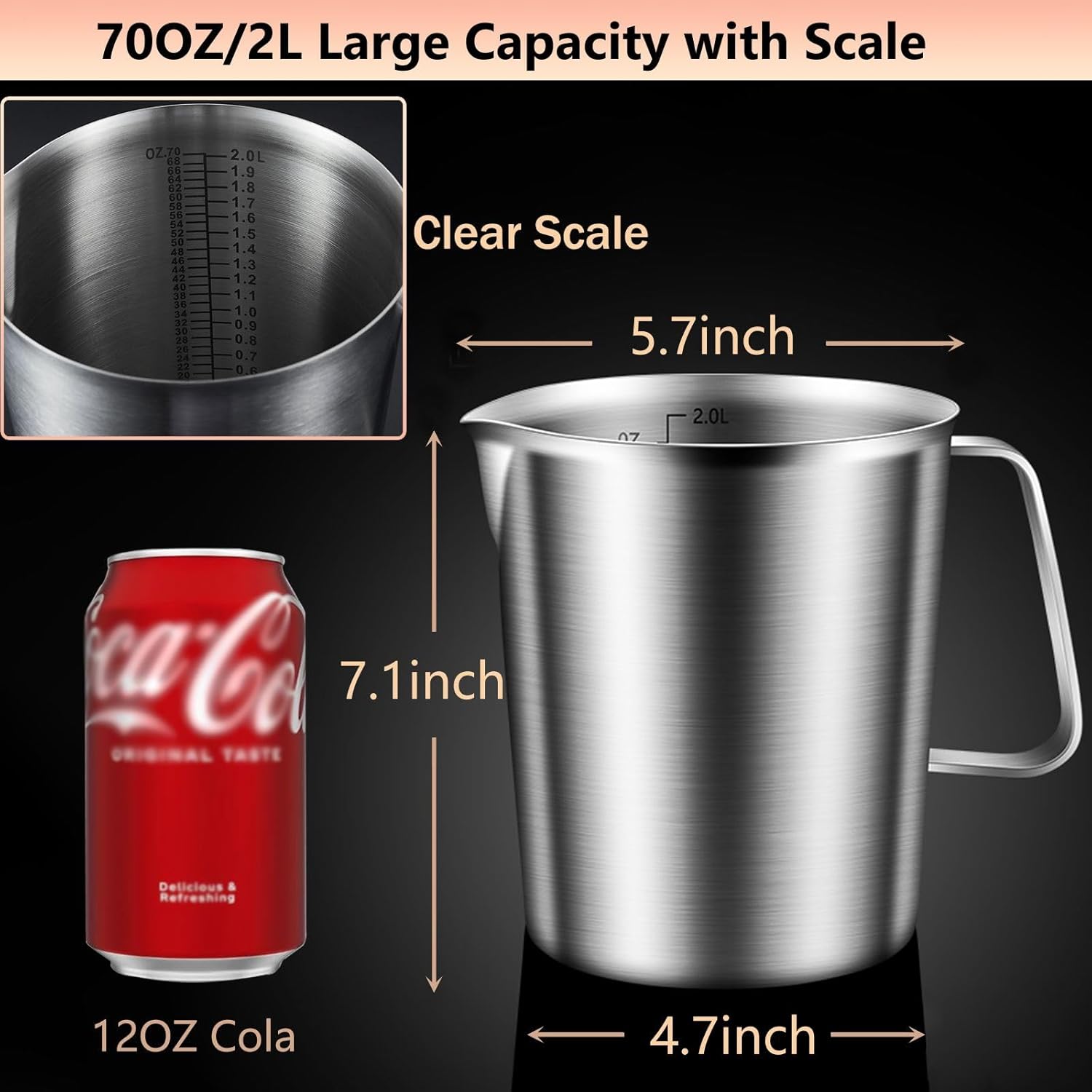 TWO MEASUREMENT SCALES: The measuring scales inside of stainless steel creamer pitcher are easy to read and have units for Ounce (0-70oz) and Liter (0-2.0L), with step value of 2 ounces and 0.1L, ensuring you control the liquid needed easily.