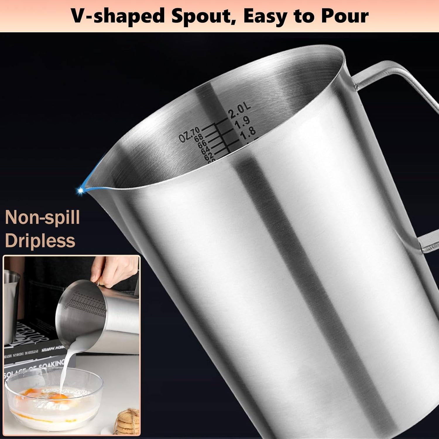 70 oz Stainless Steel Measuring Cup with Handle, Metal Milk Frothing Pitcher for Espresso Machines, Latte Art, Iced Tea, 2000 ml Beakers, Milk Frother Cup