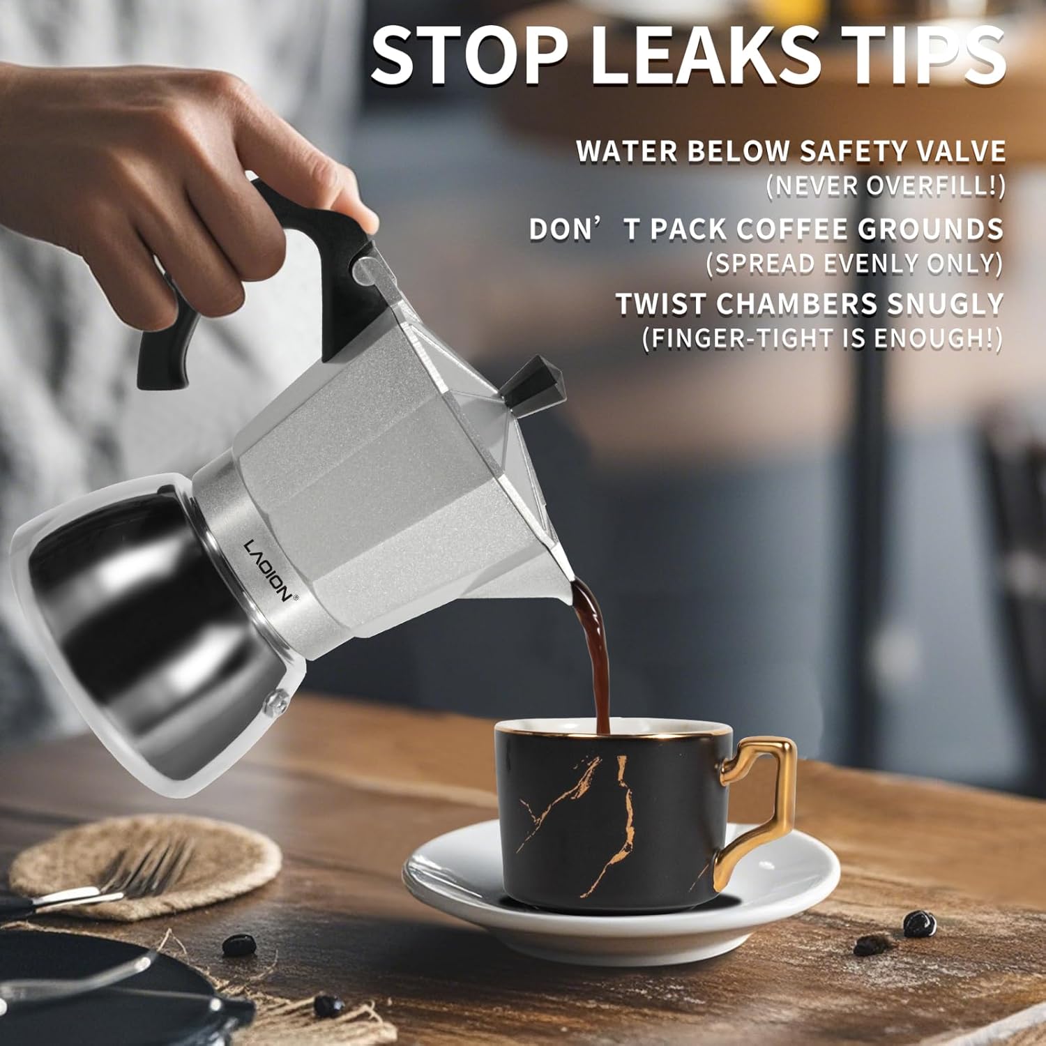 【Quick Tips to Prevent Leaks】1.When adding water, NEVER fill past the safety valve – this is the #1 cause of spills. 2.For coffee grounds, just spread them evenly – don’t pack or overfill. 3.Before brewing, always twist the top and bottom chambers until snug (finger-tight is enough!). These simple steps keep your moka pot leak-free. Happy brewing!